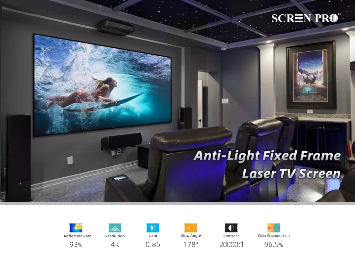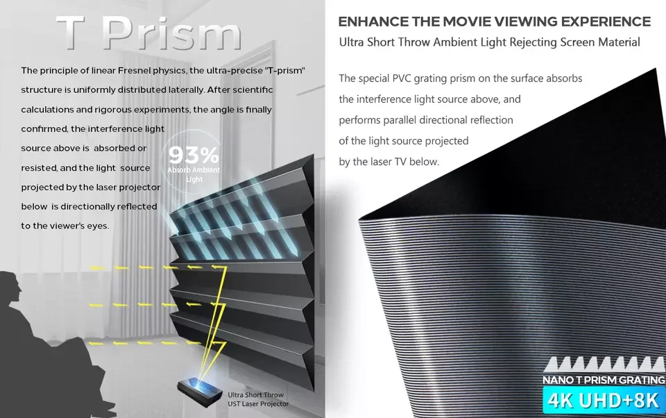Этот экран сделан специально для ультра коротких бросковЛазерПроекторы, такие как Wemax 4K Laser, Xiaomi Mijia 4K Laser, Epson 4K Laser, LG 4K Laser и HiSense. Чтобы предоставить вам лучшее качество изображения, намного лучше, чем Белая стена или обычный белый, без уст-экрана. Он имеет микроструктуру поверхности «пилочка», необходимую для оптимального отклонения изображения, проецируемого снизу экрана, на глаза зрителей. Он также отклоняет окружающей среды светильник из светильник s и отражений выше. Для получения более подробной информации, пожалуйста, прочтите или Посмотрите видео о том, как работают экраны Усть на этой странице.