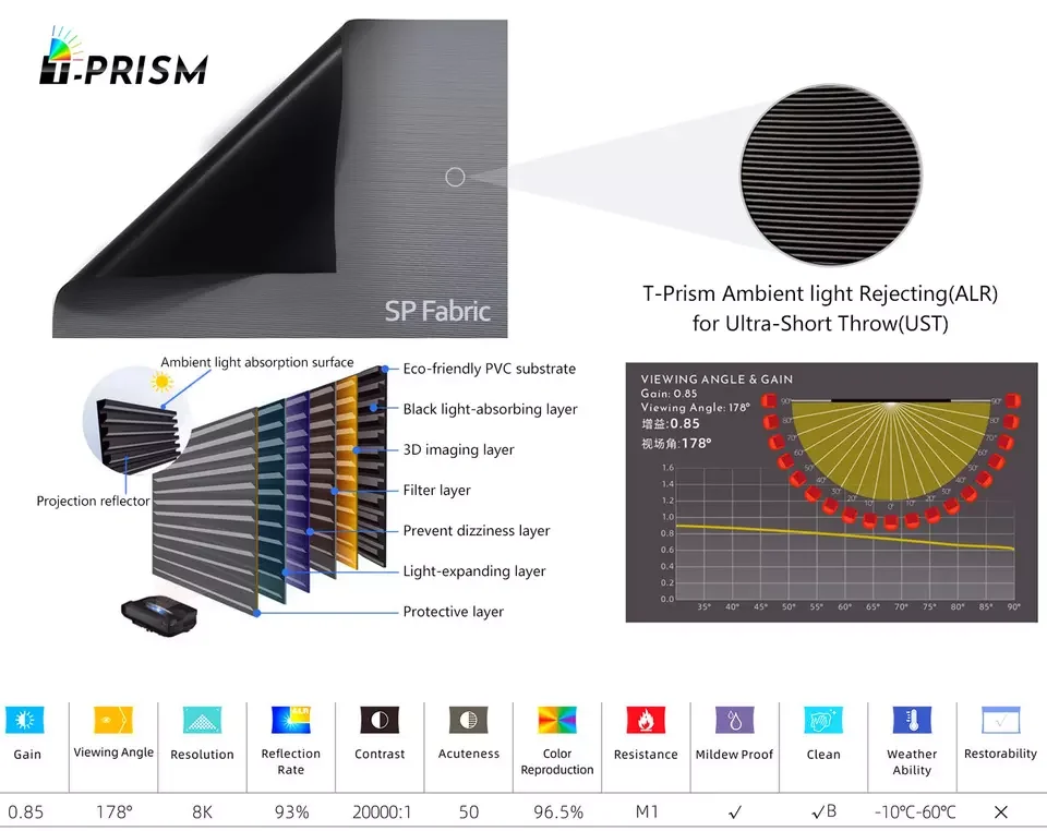 Наш материал экрана Усть алр является лучшим выбором лазерного проектора Усть, он имеет специальную оптическую структуру sawtooth и отвергающий светильник фильтр, чтобы дать потрясающую производительность в окружающем светильник. Изображения воспроизводятся без горячей пятнистости других экранов, которые полагаются на высокий коэффициент усиления, чтобы преодолеть окружающий светильник. Кроме того, светильник не отражается. В отличие от традиционного экрана, Усть алр материал способен представить изображение под яркий светильник. Он удалил туманное явление, с почти идеальным конусом обзора 160 градусов, наш USTALR материал способен быть просмотрен с экстремальных положения от оси. Даже если вы долго наблюдали, ваши глаза не будут чувствовать усталость.