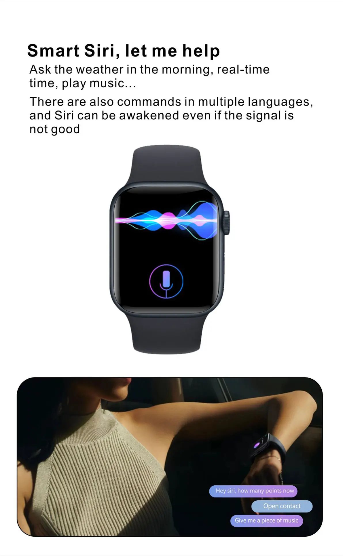 1.Information/Phone Notification/incoming call reminder.2.answer /dial call3.Heart rate/sleep/blood pressure/blood oxygen monitoring4.SportModes.5.Bluetooth music player/Bluetooth Camera6.Custom watch face7.Other functions:Alarm,Stop,watch,Vibration,Remote camera,Ringtone settings,Intelligent voice,Phone book,Clock,ect.If you need real picture, Become a deeper partner,please add our whatsapp: