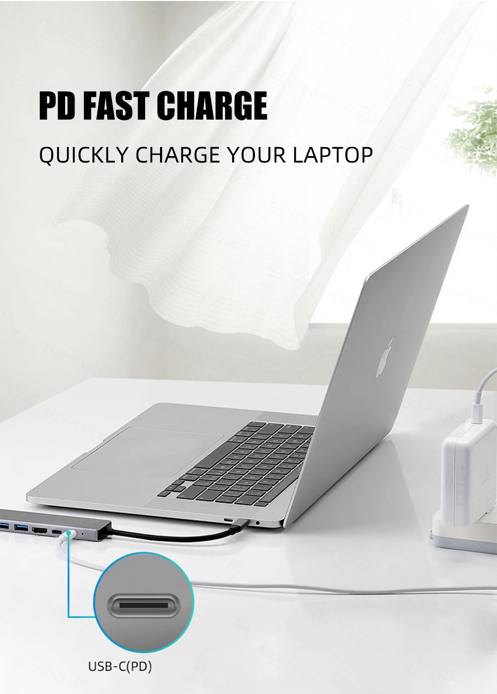 (5) 6 в 1 :HDMI(4 к/30 Гц) + USB2.0 + USB3.0 + Type-C + 100 м RJ45 + PD(100 Вт)