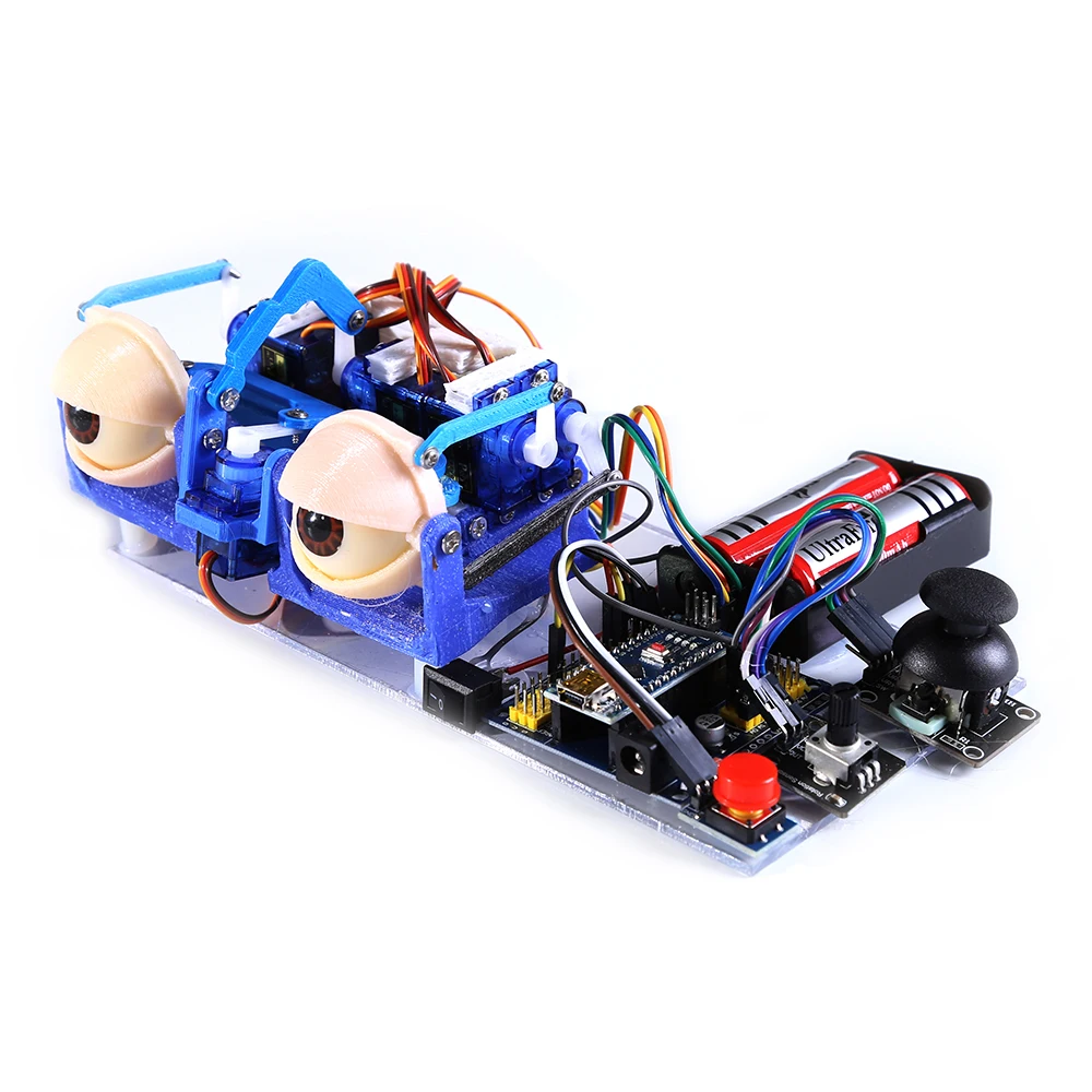 Продукт включает в себя шесть сервоприводов SG90, один отвечает за поворот глазного яблока влево и вправо, один отвечает за поворот глазного яблока вверх и вниз, два-за открытие и закрытие верхнего века, И два отвечают за открытие и закрытие нижнего века, они могут двигаться вместе. Демонстрационная система поставляется с простыми кнопками, и он отвечал за мигание. Ручка потенциометра отвечает за размер отверстия для глаз, а двухосевой джойстик X Y контролирует положение глазного яблока.