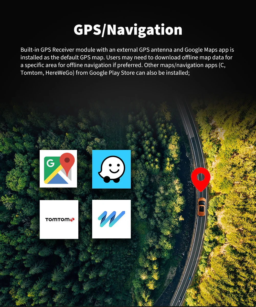 Встроенный модуль gps-приемника с внешней GPS антенной и приложением Google Maps устанавливается в качестве GPS карты по умолчанию. Пользователи могут загружать данные автономной карты для определенной области для автономной навигации, если это необходимо. Другие карты/навигационные приложения (Waze, Tomtom, HereWeGo) из Google Play Store также могут быть установлены;