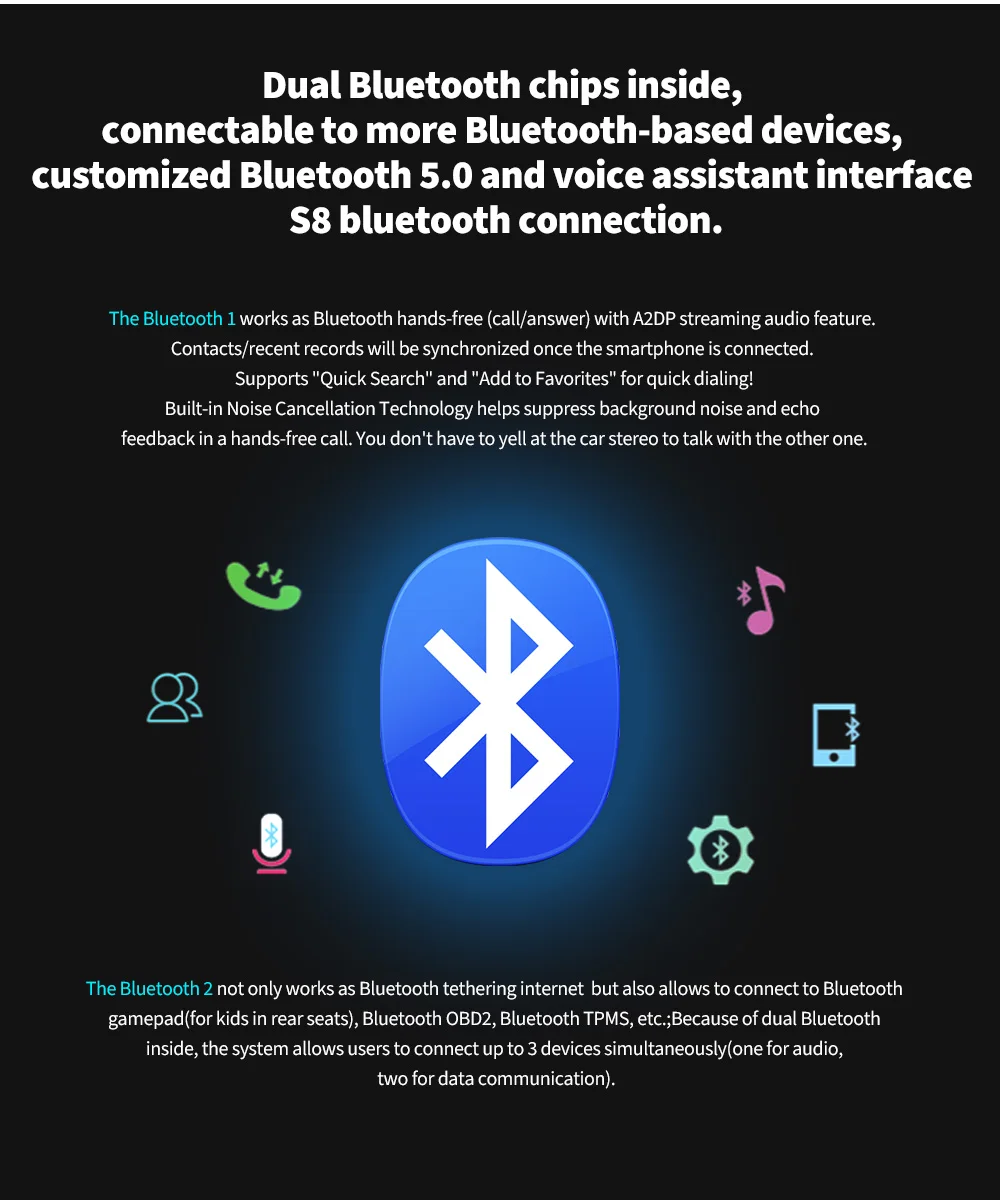 Bluetooth 2 работает не только как Интернет-соединение Bluetooth, но также позволяет подключаться к bluetooth-геймпаду (для детей на задних сидениях), Bluetooth OBD2, Bluetooth TPMS и т. д.;