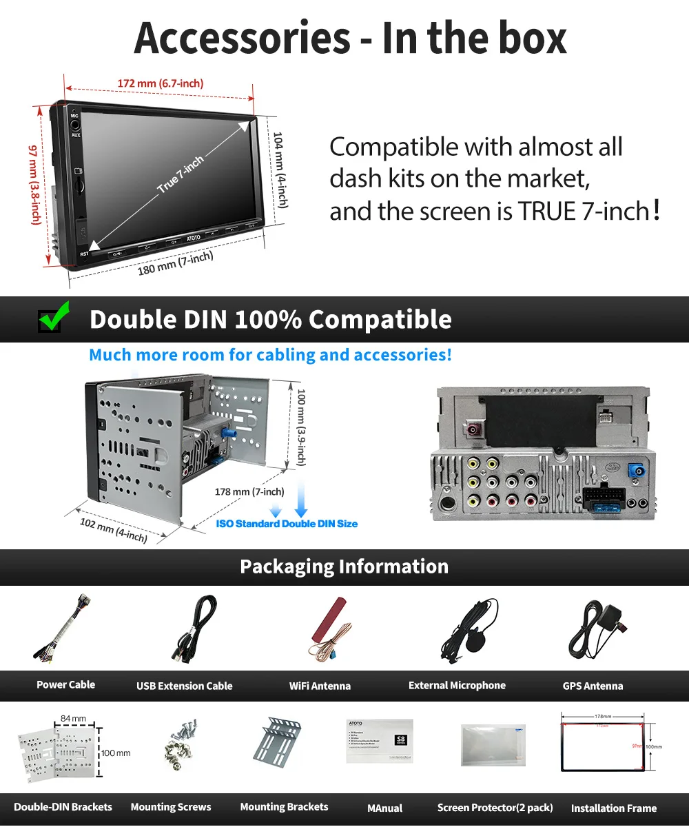 В настоящее время, передняя панель 7 дюймов aftermarket автомобильный стерео имеет различные размеры (178 мм x 100 мм, 178 мм x 102 мм, 180mmx102). Тем не менее, большинство поставщиков монтажных адаптеров (Metra, Scosche, PAC и т. д.) в основном обеспечивают 174 мм x 98 мм открывание приборной панели, множество пользователей столкнулись с проблемами/проблемами во время установки. ATOTO S8 универсальные двойные модели din используют Размер 192 мм x 97 мм, и могут идеально подойти к ним, не требуется обрезки/резки!