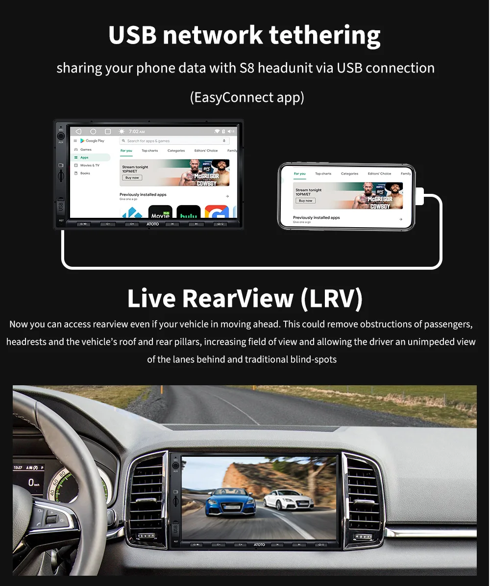Обмен данными о вашем телефоне с головным устройством S8 через usb-соединение (приложение EasyConnect); Живое зеркало заднего вида (LRV) -Теперь вы можете получить доступ к заднего вида, даже если ваш автомобиль движется вперед. Это может устранить препятствия для пассажиров, подголовников и крыши транспортного средства и задних столбов, увеличивая поле зрения и позволяя водителю беспрепятственно смотреть на полосы позади и традиционные слепые пятна