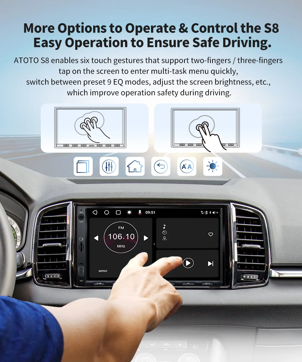 ATOTO S8 позволяет использовать шесть сенсорных жестов, поддерживающих два/три нажатия пальцев на экране, чтобы быстро войти в меню многозадачных задач, переключаться между предустановленными 9 режимами эквалайзера, регулировать яркость экрана и т. д. Которые улучшают безопасность эксплуатации во время вождения.