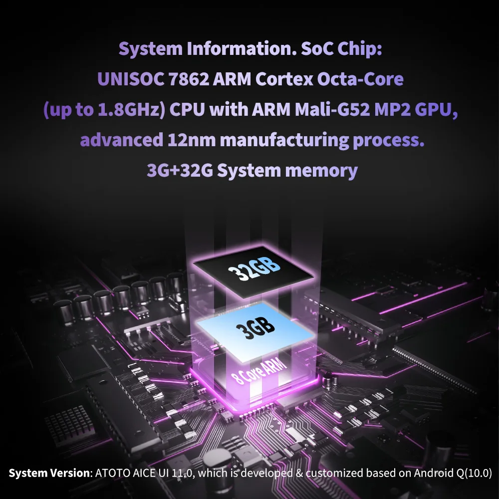 2:UNISOC 7862 ARM Cortex восьмиядерных процессор (до 1,8 ГГц) Процессор с ARM Mali-G52 MP2 GPUSystem версия: ATOTO AICE UI 11,0, который разработан и настроен на базе Android Q (10,0);