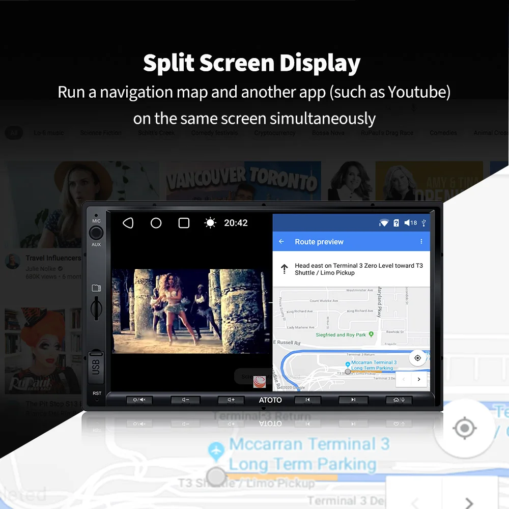 Отображение разделенного экрана-одновременно запускайте навигационную карту и другое приложение (например, Youtube) на одном и том же экране;