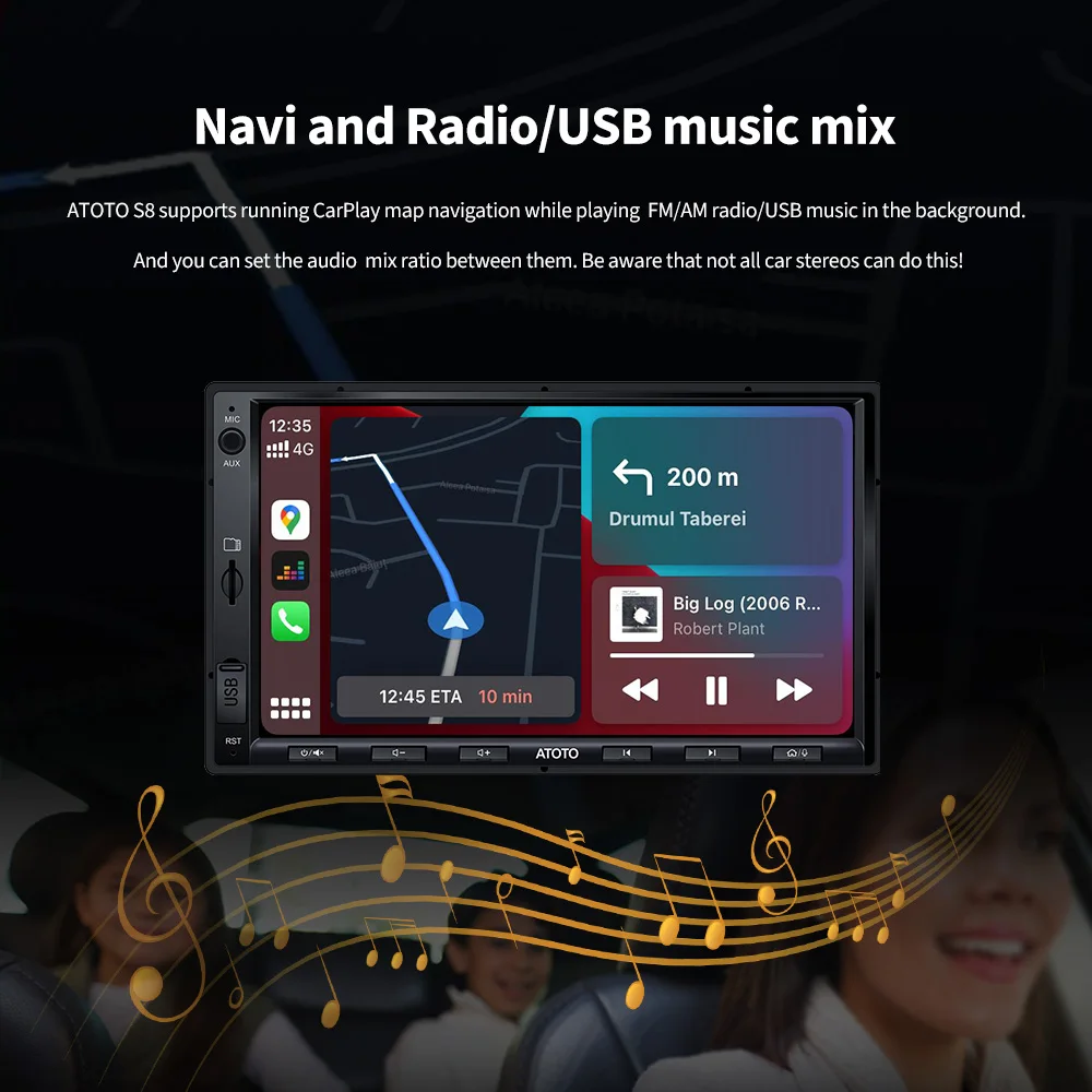 ATOTO S8 поддерживает Запуск CarPlay карты навигации во время воспроизведения FM/AM радио/USB музыки в фоновом режиме. И вы можете установить Соотношение Аудио mix между ними. Имейте в виду, что не все автомобильные стереосистемы могут это сделать!
