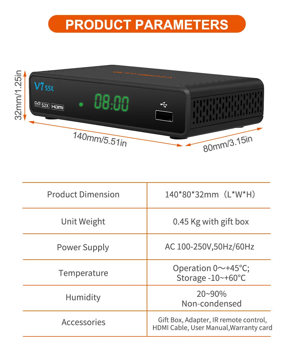 V7S5X-это спутниковый ТВ-приемник, это глобальная версия, с новейшим цифровым спутниковым ТВ стандартным DVB-S2X и декодированием видео H.265.