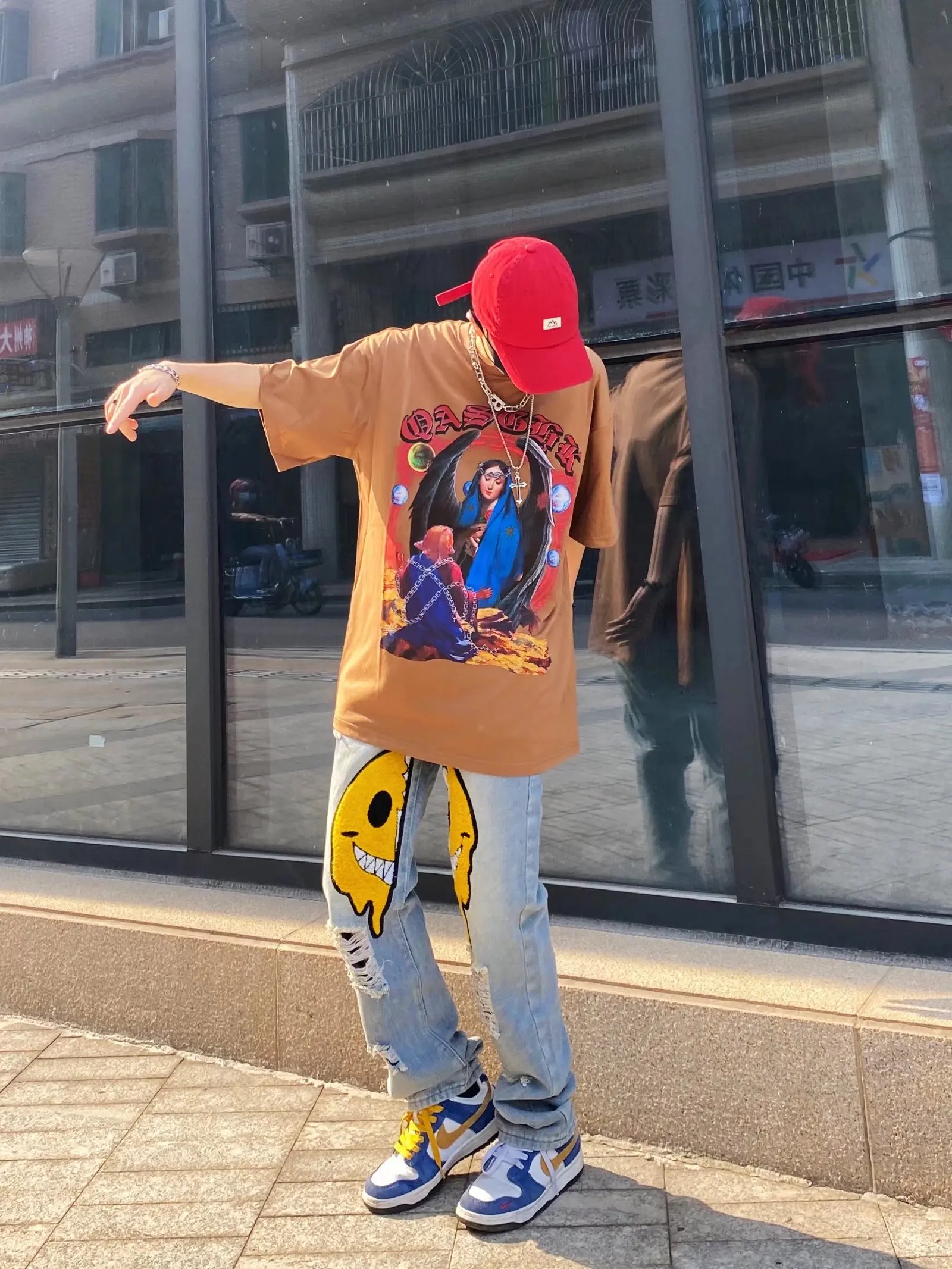 Отзывы о Модные осенние мужские джинсы 2022 забавные рваные со смайликом широкие брюки для