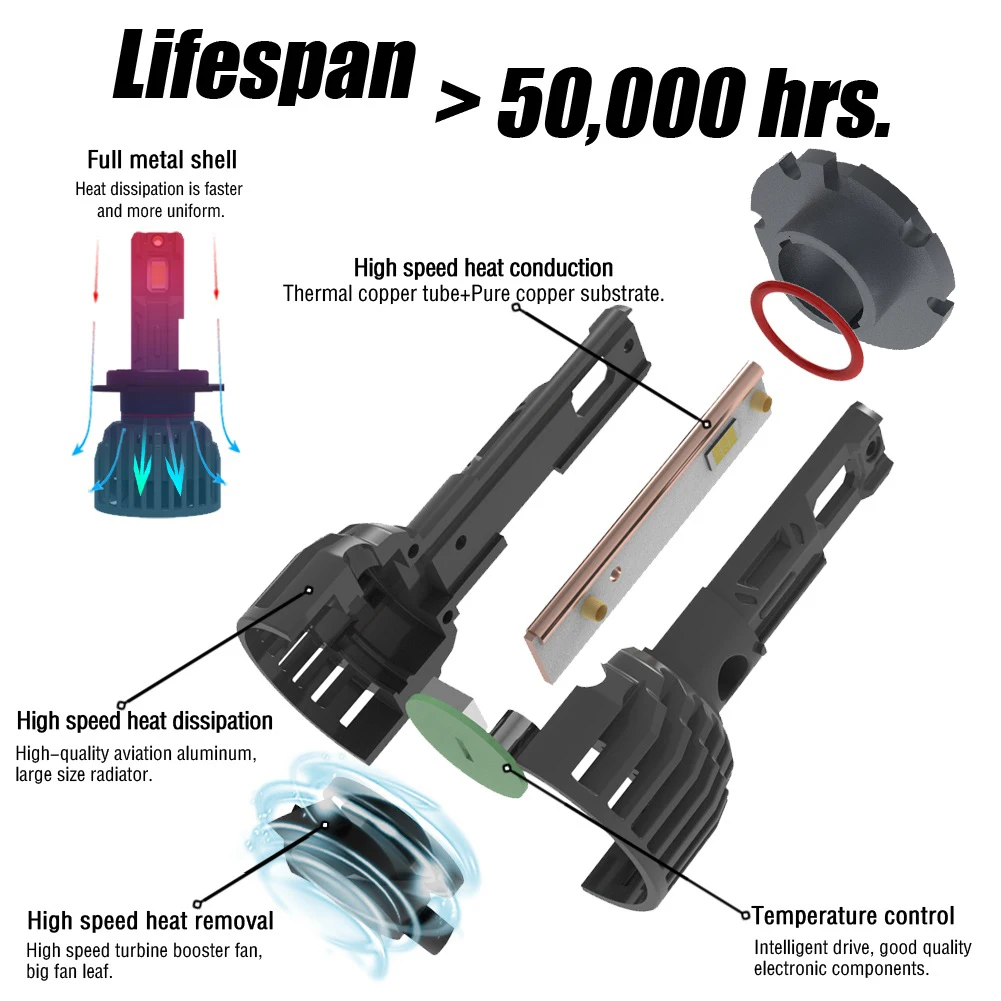 Технология четырехкратного охлаждения. Подложка из чистой меди, теплопередача быстрее. Авиационный алюминиевый корпус, общая теплоотдача. Интеллектуальный драйвер контроля температуры. Высокоскоростной вентилятор с турбонаддувом быстро рассеивает тепло. Эти советы помогут продлить срок службы изделия составляет более 50000 часов.