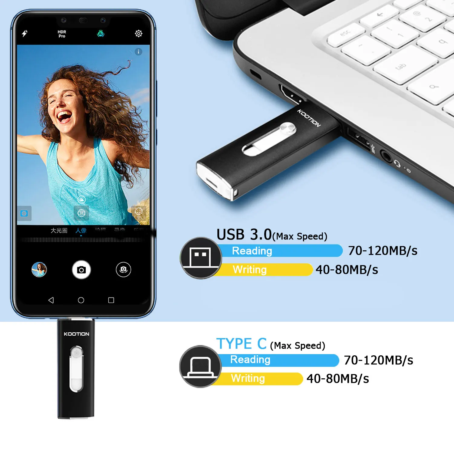 Plug and Play - Kootion U21 USB флэш-накопитель с USB-A и Type-C простой заглушкой флэш-накопитель, затем начать передачу и хранение данных между устройствами. Нет необходимости устанавливать любое программное обеспечение, которое вы можете легко передавать цифровые файлы, изображения, музыку и видео с быстрой скоростью.