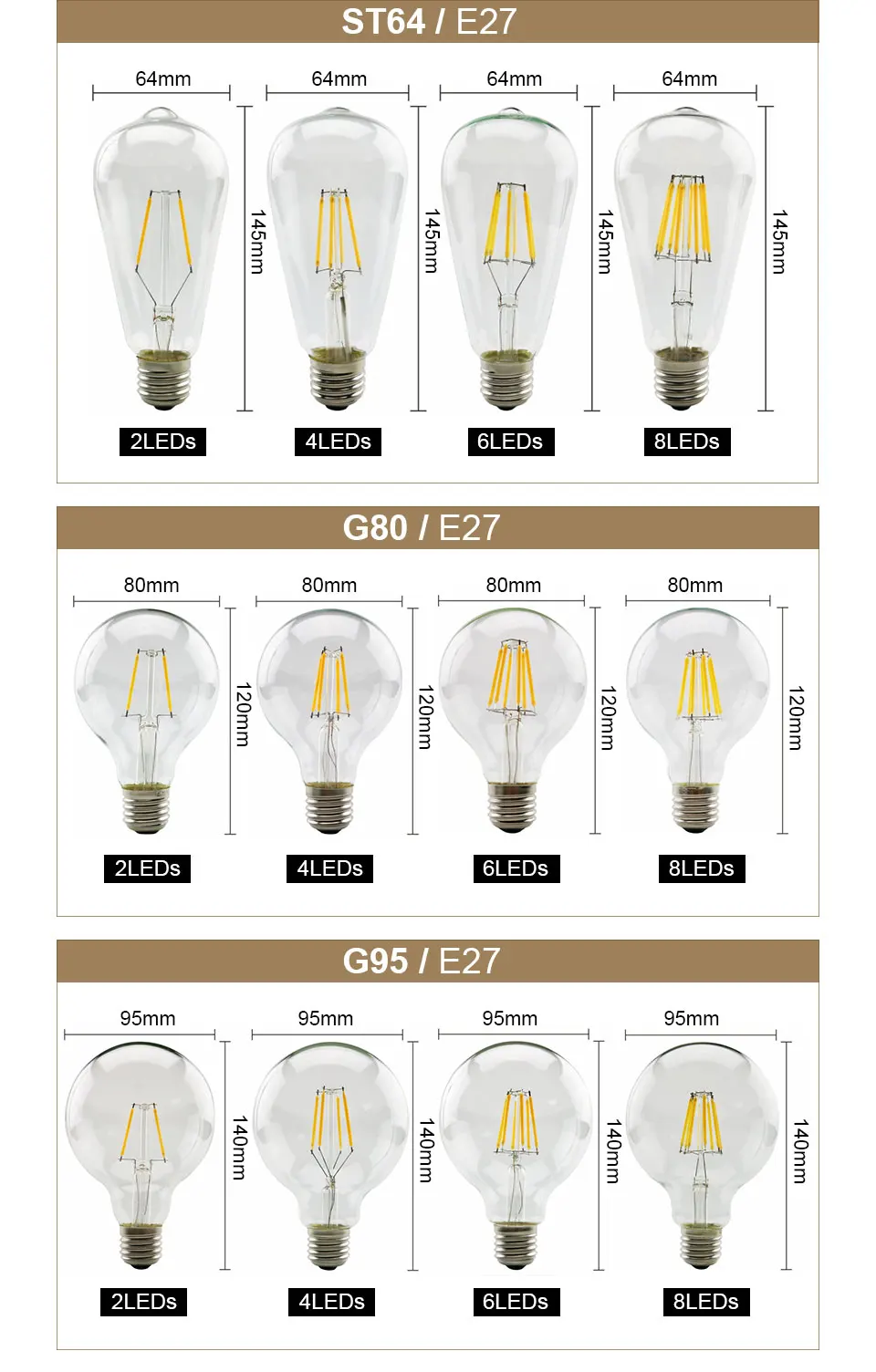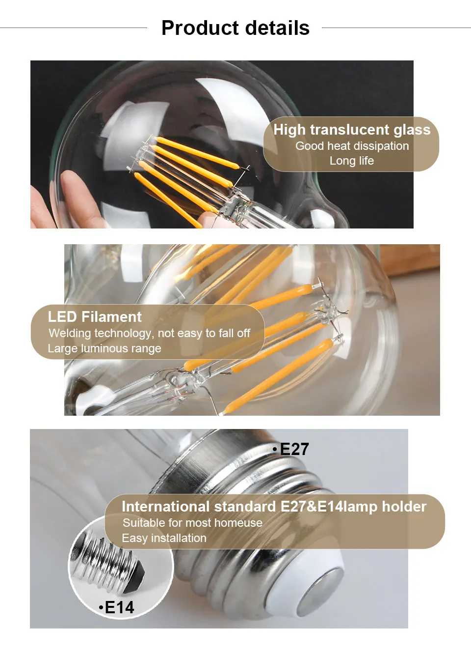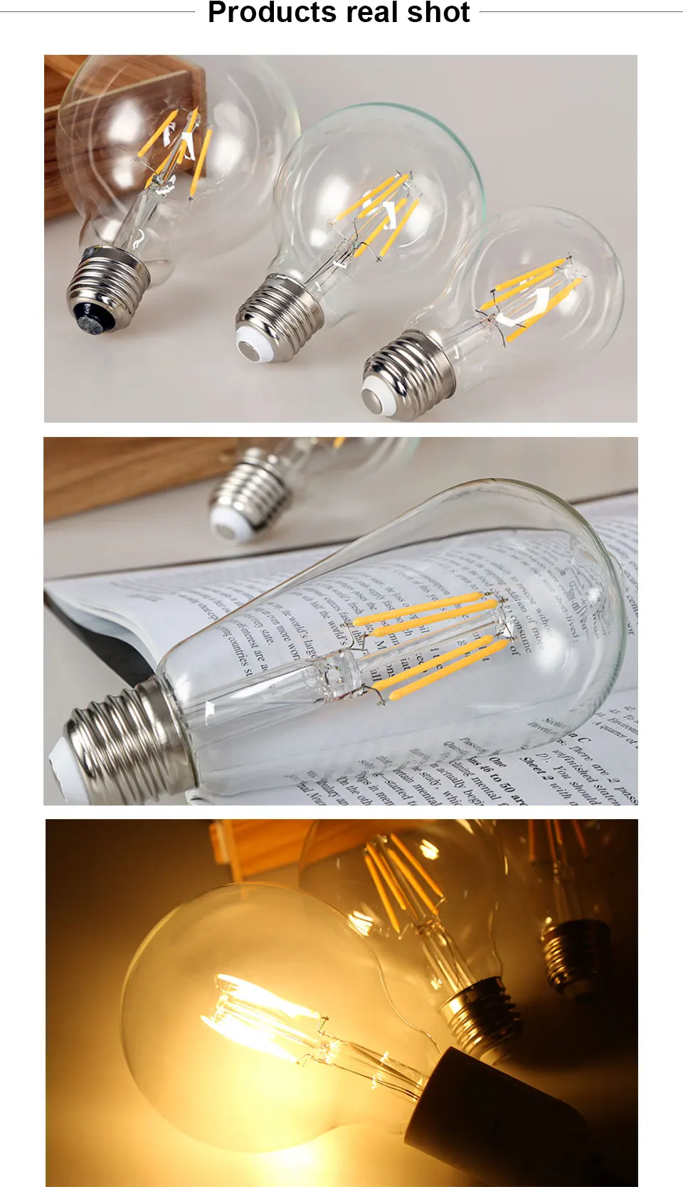 Тип цоколя: E27/E14 Мощность: 2 Вт/4 Вт/6 Вт/8 Вт Светодиодный Филамент Количество: 2 шт./4 шт./6 шт./8 шт. (1 шт. светодиодный Филамент-только мощность 1 Вт) Цветовая температура: холодный белый 6000-6500K/теплый белый 2700-3500K Напряжение: 220 В-240 В переменного тока CRI: 85Ra Угол луча: 360 ° Материал: стеклоСредний срок службы:> 50000 часов