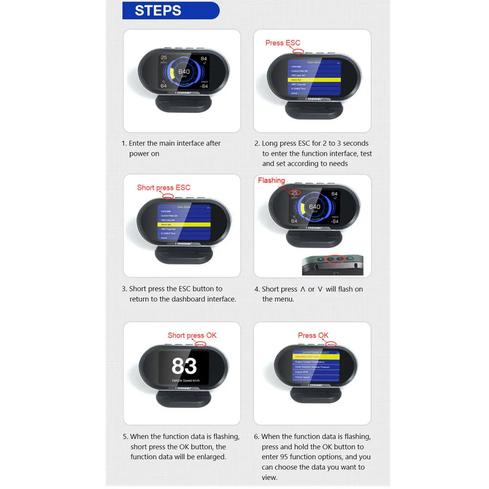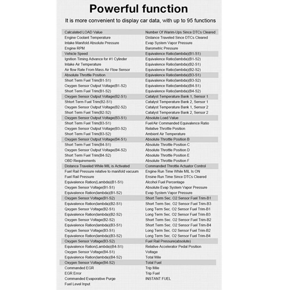 5. Разнообразный дисплей функции параметров автомобиля, поддерживает отображение в реальном времени 95 наборов данных, включая уровень топлива, значение нагрузки двигателя, расход топлива, считывание датчика кислорода, B1S1, B2S1 и т. Д.