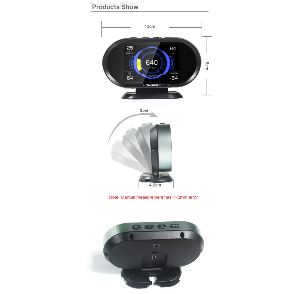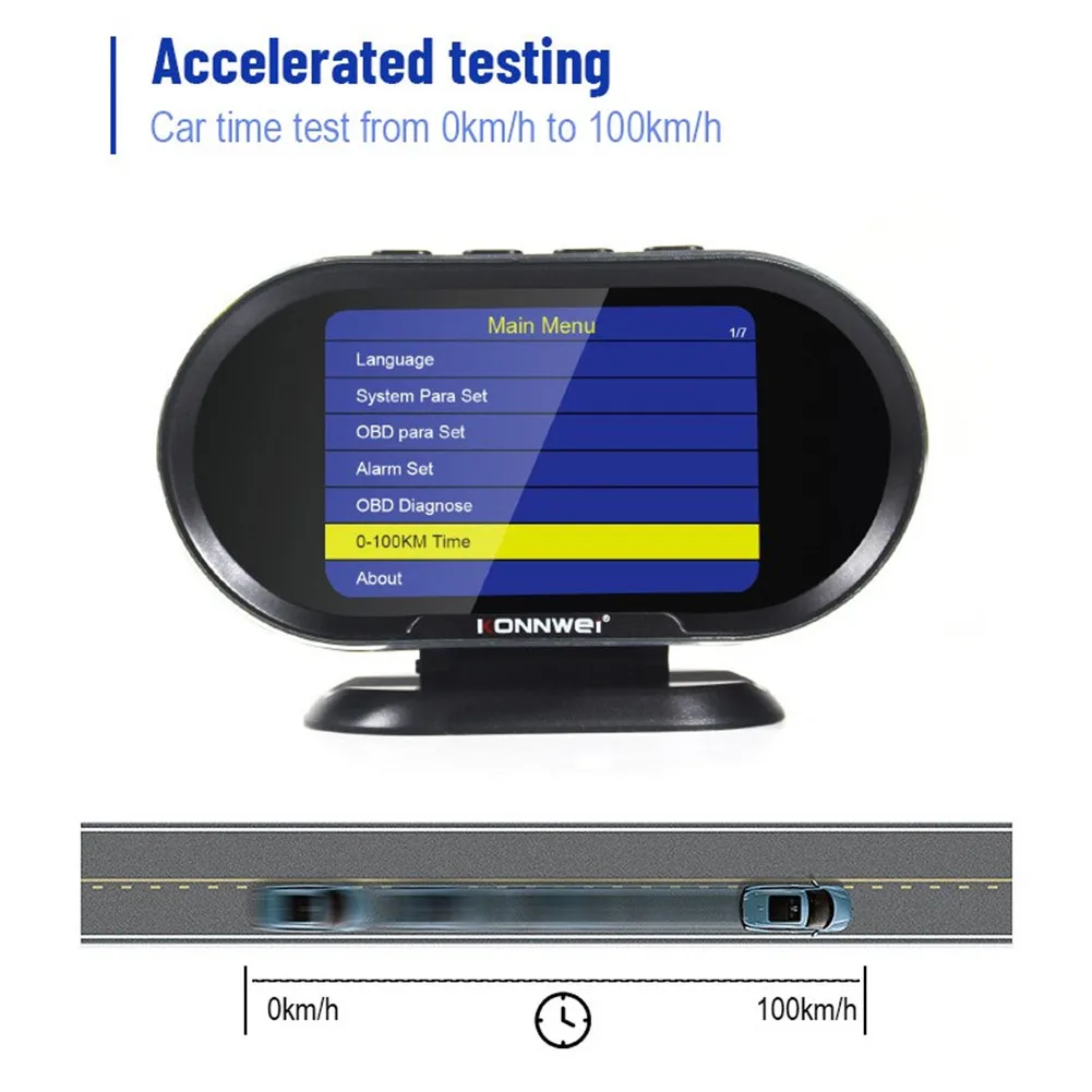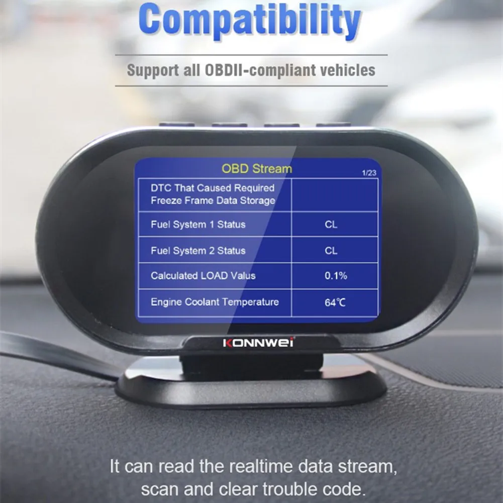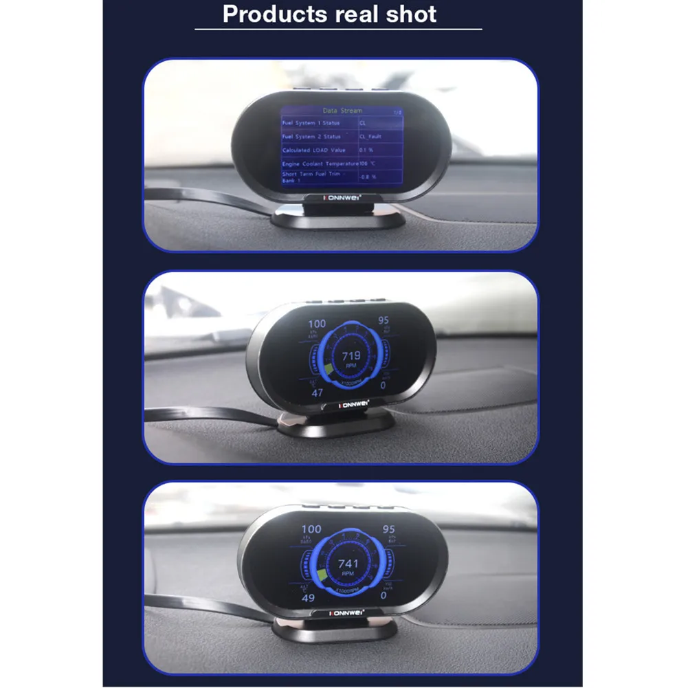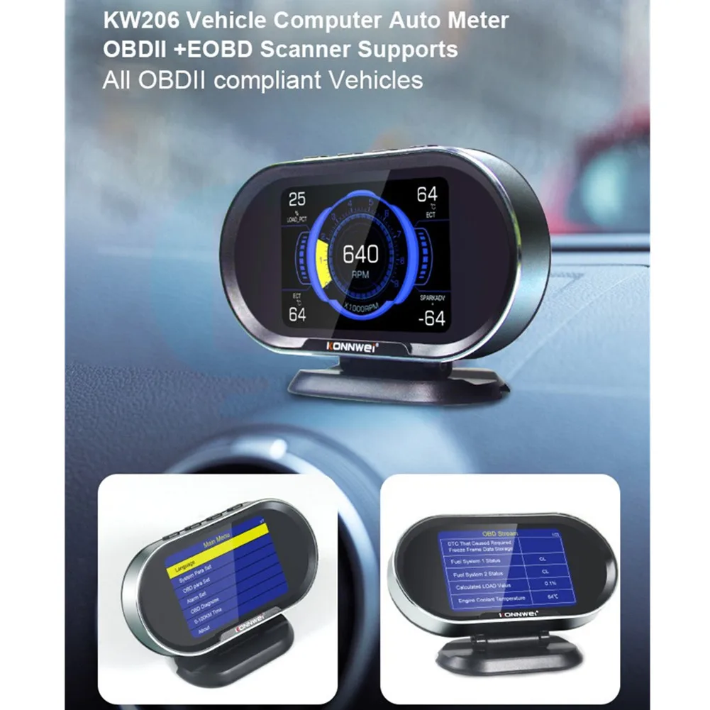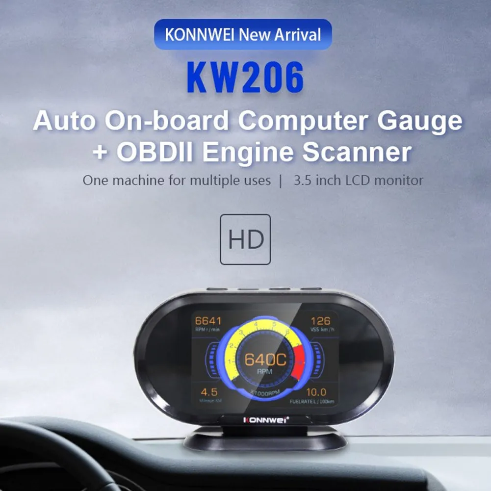 Компьютер KONNWEI KW206 OBD-это умный и мощный автоматический счетчик. Он специально разработан для транспортных средств, чтобы показать все данные на одном экране от спидометра, датчика температуры двигателя, масла, калибра, расходомера топлива и так далее.