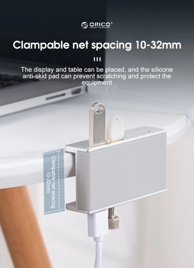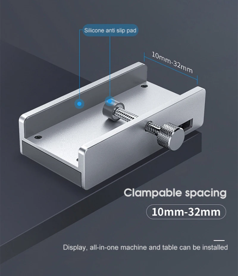 Он может зажимать край монитора или стола с интервалом 10-32 мм, И силиконовая противоскользящая накладка может предотвратить царапины и защитить оборудование.