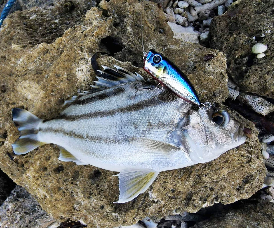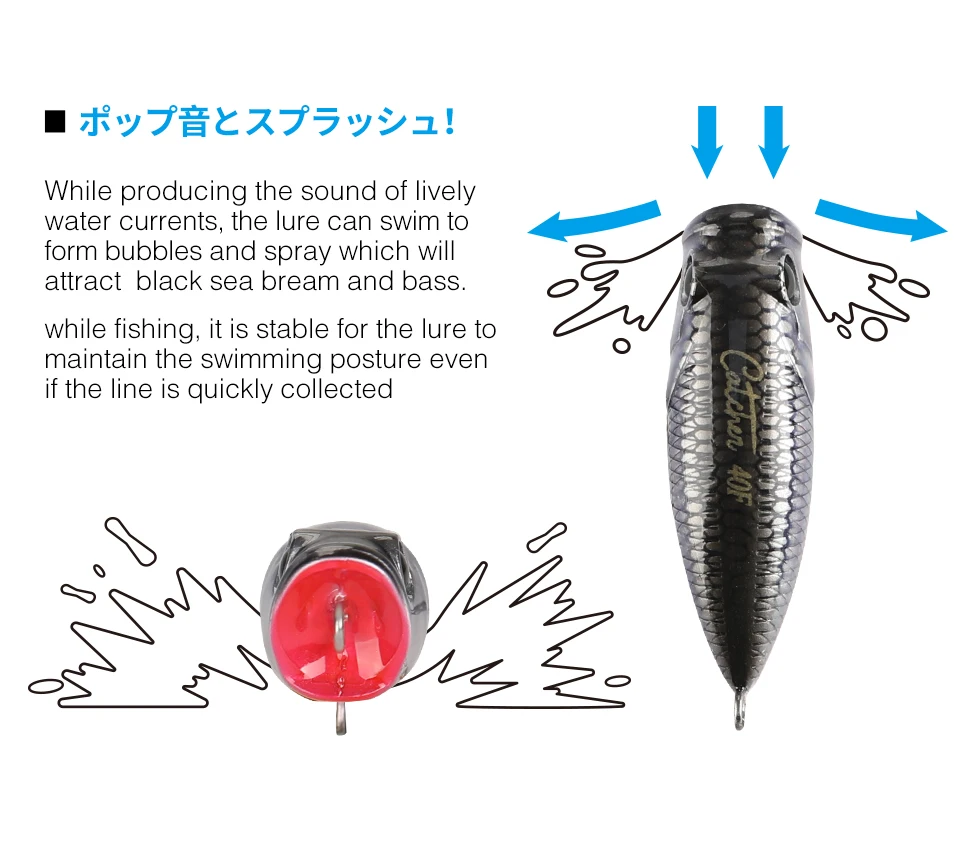 Производя звук живого водного потока, приманка может плавать, образуя пузырьки и спрей, которые привлекут черный морской хлеб и бас. Во время рыбалки приманка устойчива для поддержания осанки плавания, даже если леска быстро собирается
