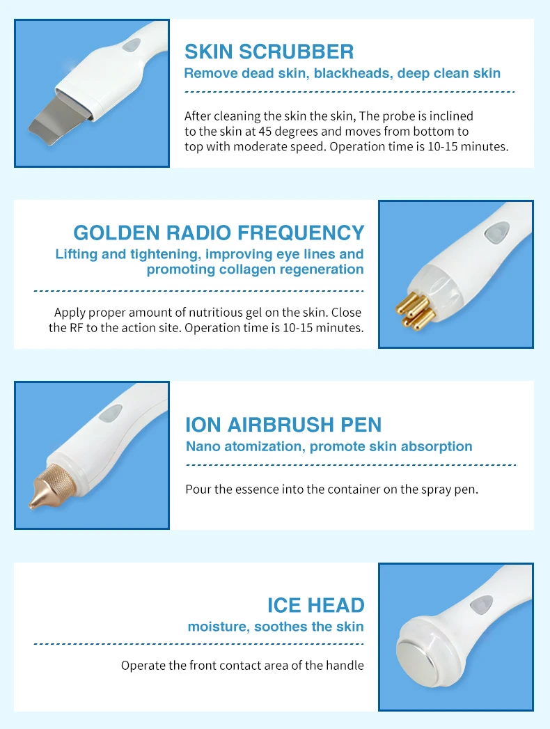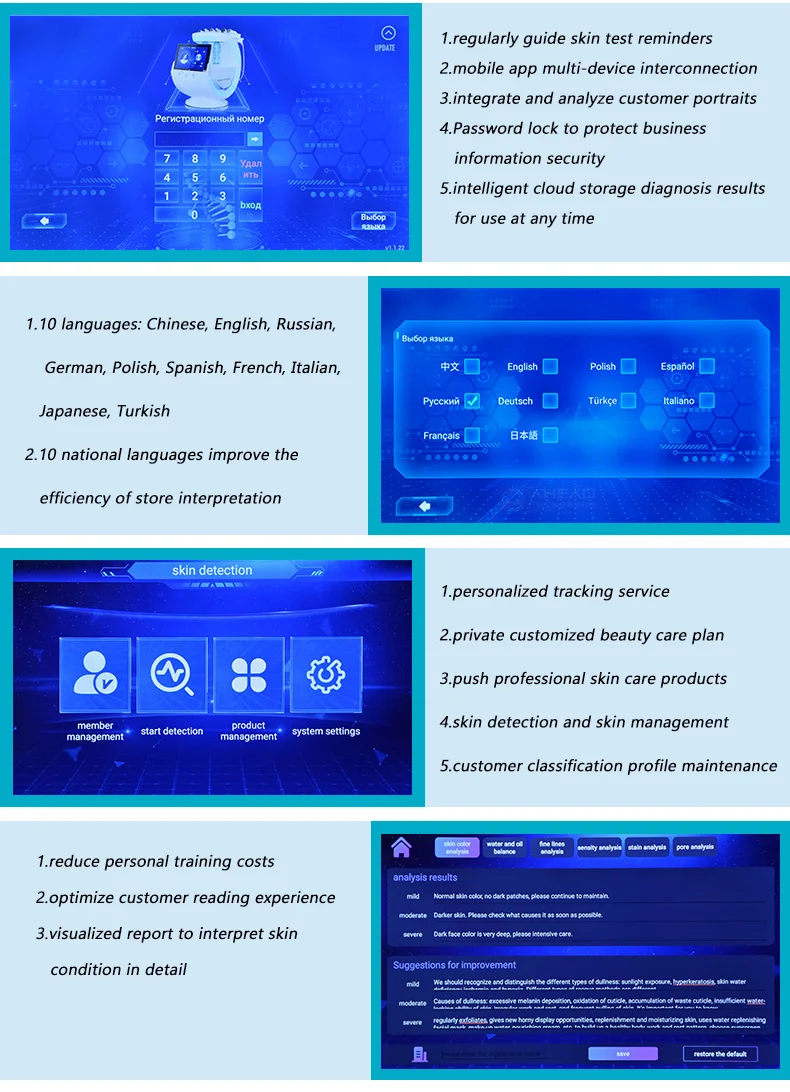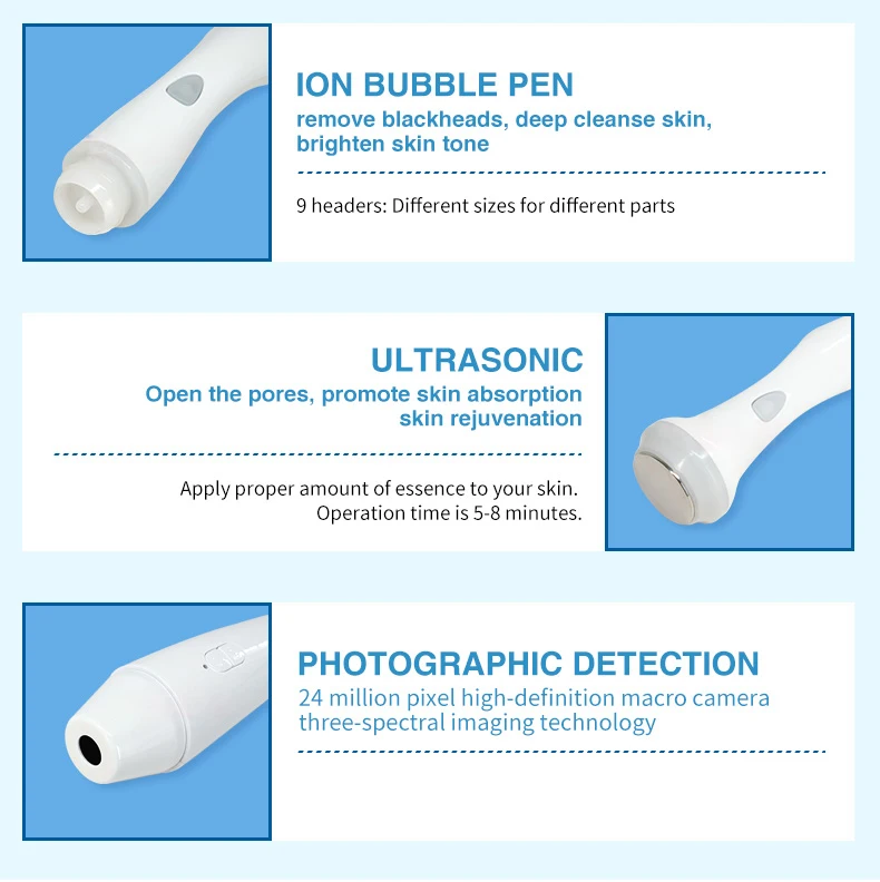 24 мегапиксельная HD Макросъемка в сочетании с триспектральной технологией визуализации для сбора детальных изображений кожи лица, интеллектуального и всестороннего обнаружения, анализа и диагностики проблем кожи и профессионально рекомендовать соответствующие программы и продукты по уходу за кожей; 6 высокопроизводительных операционных ручек различных технологий: ультразвуковая ручка, RF ручка, ультразвуковой скруббер, ручка для дермабразии, Холодный и Горячий Молоток, распылитель для очистки кожи, подъема, затягивания, осветления, удаления морщин и черных точек и т. д.