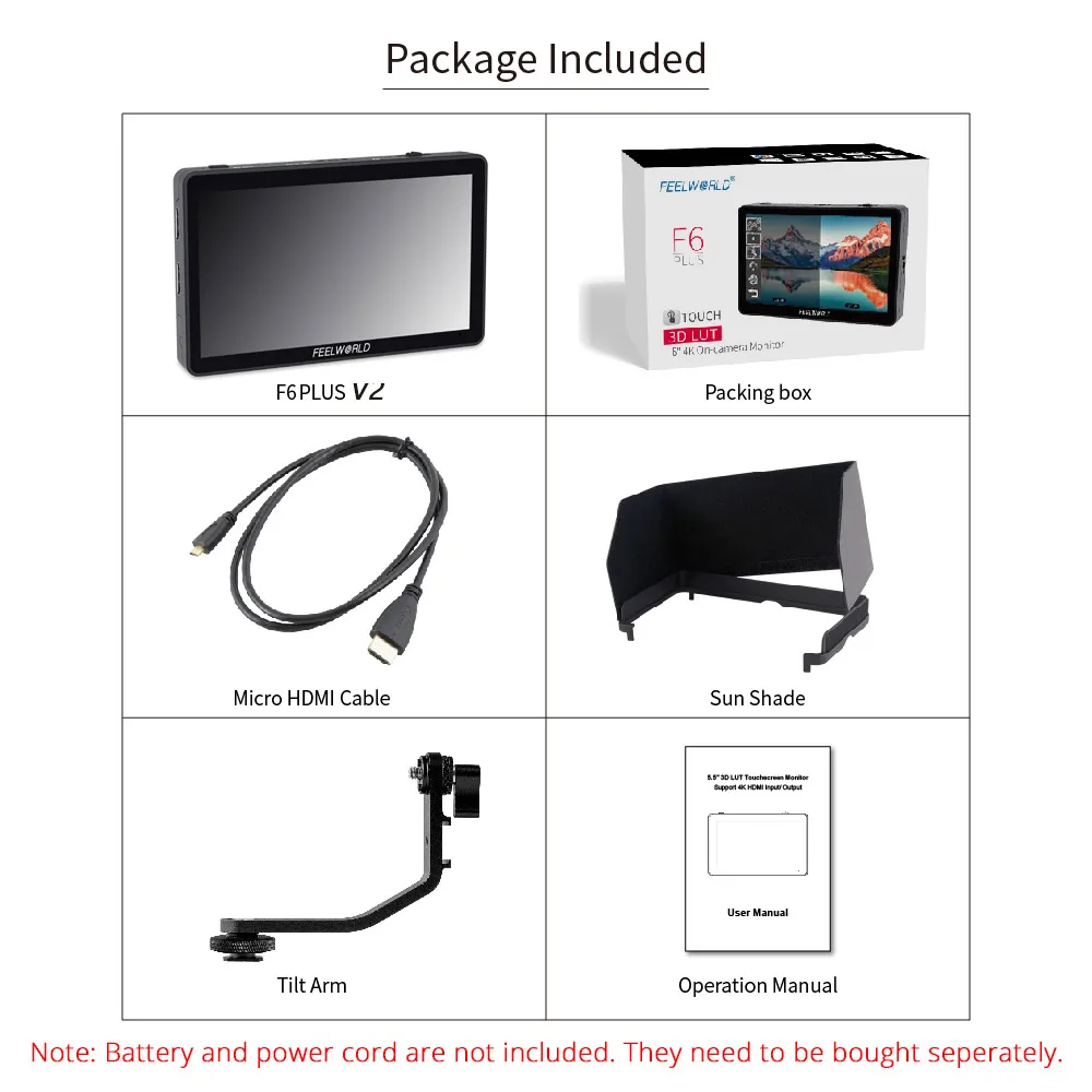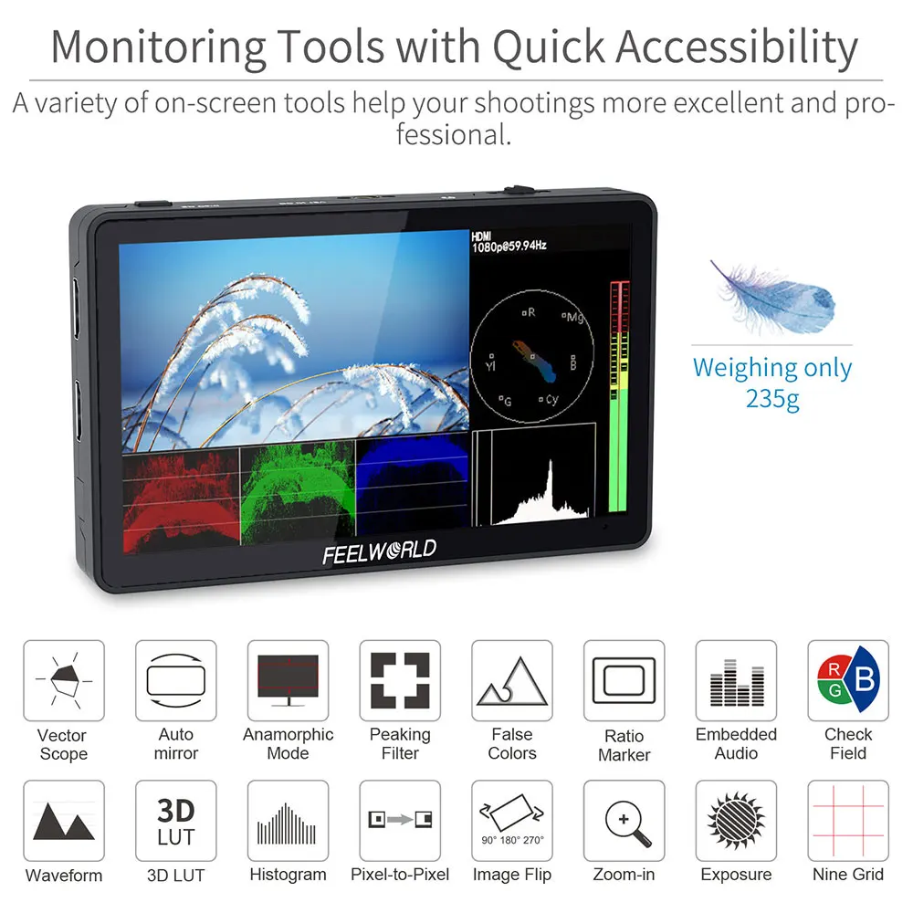 Светильник тонкий, только 235 гF6 PLUS 6 дюймов и только 235 г, и делает его идеальным размером и весом для полевого производства. Конструкция всего монитора прочная и компактная, что позволяет легко установить его на камеру DSLR или даже на Стабилизатор карданного шарнира. Это дает вам свободу снимать хорошо в любом месте.