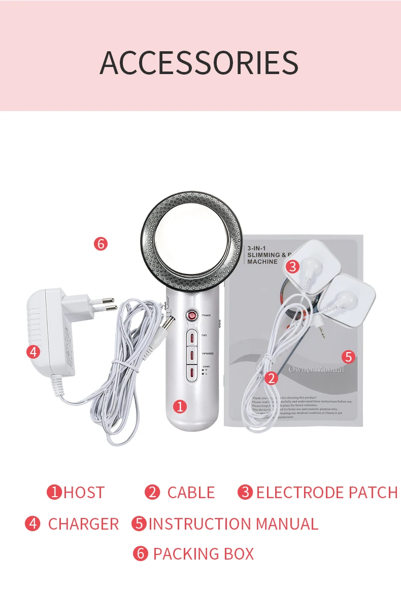 Характеристика:EMS лечение кожи и похудения. Инфракрасное устройство для термической терапии омоложения кожи.Улучшает текстуру кожи, против морщин, помогает бороться с жировыми участками, подтягивает.Быстро и эффективно уменьшает и избавляет от тяжелых хронических болей в спине, других видов боли в теле.Регулируйте внутреннюю секрецию и ускоряйте употребление жира, воплощайте мечты о похудении.Мини и стильный внешний вид, удобно носить с собой, прост в использовании.Для лица и телаТеория лечения:1. Ультразвук имеет три основные функции, он может изменить емкость и движение каждой клетки с точной функцией массажа, которая называется массажем клеток.2. Он может стимулировать и регулировать цитомембрану, увеличить проницаемость эпидермиса, его тепловых, физические и химические эффекты могут повысить температуру в глубокой коже на 0,5-1 °C, повышает кожу, чтобы впитать эссенции, ускоряет метаболизм и усиливает регенеративный ход ткани.3. Ультразвуковой может также разложить отходы окружающего жира, потреблять энергию, восстанавливать лимфатические и капиллярные сосуды с весомСпецификация:Название: 3 в 1 машина для похудения телаВход адаптера питания: AC100-240VВыход адаптера питания: DC15V 800mAЧастота звукового сигнала: 1 МГцВес нетто: 140 гРазмеры: 190*80*60 ммВнимание к хранению:1. Не используйте это устройство, когда вы обнаружите, что провод питания горячий, повреждение или адаптер питания становятся гибкими2. Держите устройство подальше от воды или влаги3. Когда вы не используете устройство, пожалуйста, отрежьте powei4. Держите подальше от детей.5. У пациентов, беременных женщин и сердечных пациентов это устройство не работает.Это устройство имеет 3 функции:EMS + инфракрасный + Ультразвуковой> мультиплированный эффектИнструкции для формирования линии тела:Шаг l: Очистите кожу перед нанесениемШаг 2: лучше делать на тех частях, которые нуждаются в похудении. Лучше использовать акупунктурную точку.Шаг 3: растягивает форму тела на вашей кожеШаг 4: массируйте вашу кожу ультразвуковой волной и дальним инфракрасным излучением (подробности pleaserefertoИнструкции) до тех пор, пока продукт не будет полностью поглощен (подробности см.К инструкции). Этот шаг стимулирует поглощение фигуры продукта во времяСтимулирует кровообращение и обмен веществ, делает вашу кожу еще более упругой!Обратите внимание: ультразвуковая волна и Дальний инфракрасный свет вызовут ощущение тепла для вашей кожи. Это нормальное явление, пожалуйста, используйте с легкостью (машина будет автоматически снижать температуру, когда она достигнет ограничения)Инструкции по использованию ультразвука:Перед апликацией, itiserucialto выбрать соответствующий skincarepro educt.Itisnot noly conduction medium, но также iprtanteleme "предлагает питательные вещества для вашей кожи. Поэтому, перед использованием этого режима, всегда необходимо применять средства по уходу за кожей.Шаг 1 очистите кожу перед нанесением.Шаг 2 равномерно распределяет форму тела на вашей коже (нанесите продукт на каждую секцию, чтобы предотвратить высыхание воздуха и привести к непарному поглощающему эффектуШаг 3 Подключите устройство для похудения и украшения.Шаг 4 включите питание (питание), и красный светильник начнет мигать.Шаг 5 нажмите звуковую кнопку-один раз для низкой интенсивности (низкой), два раза для высокойИнтенсивность (высокая). Исп