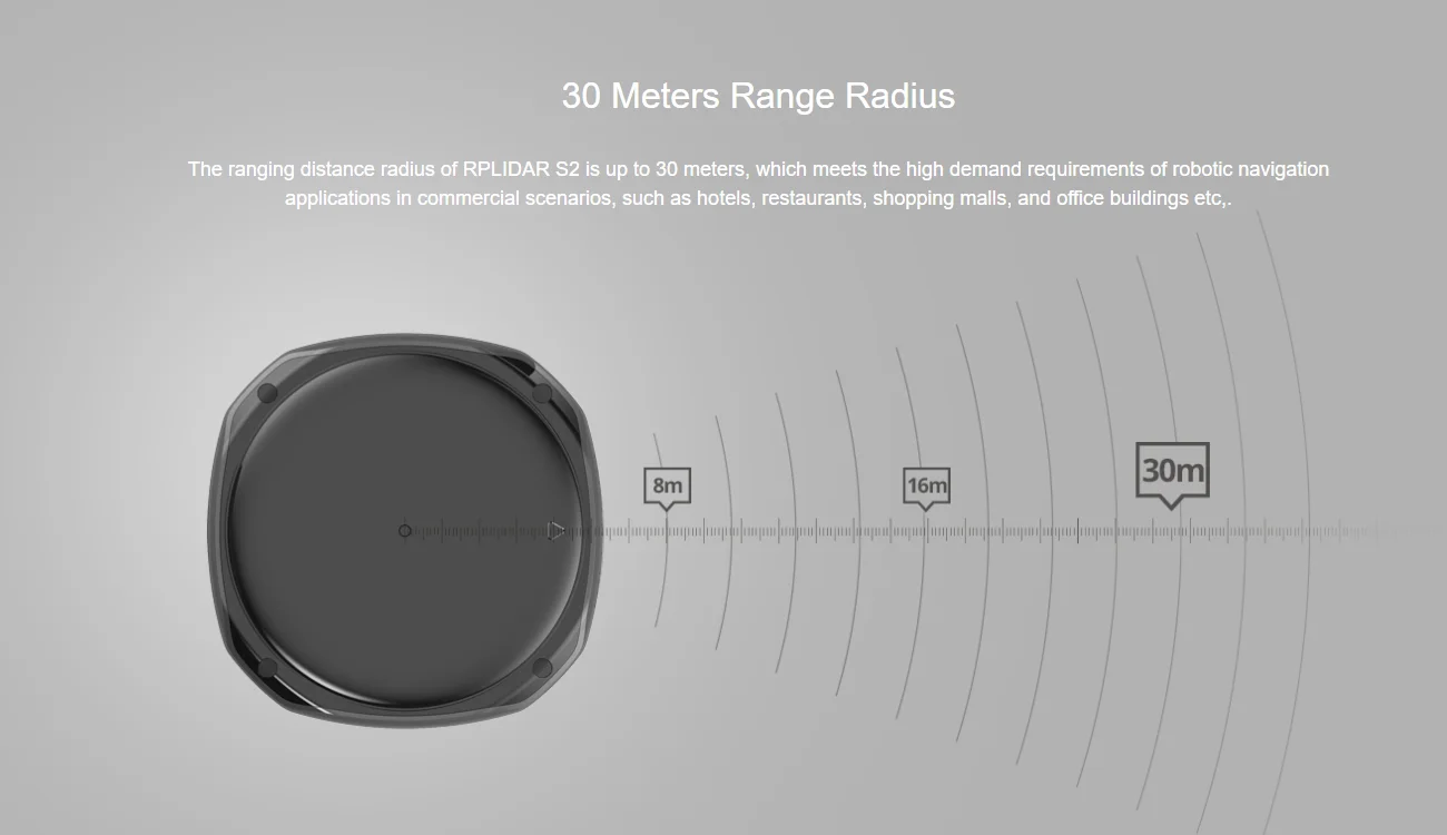 RPLIDAR S2-это новое поколение недорогого 2D лазерного сканера 360 градусов (LIDAR), разработанное SLAMTEC. Это может занять до 32000 образцов лазерного диапазона в секунду с высокой скоростью вращения. И оснащенный запатентованной технологией SLAMTEC OPTMAG, она нарушает ограничение срока службы традиционной системы LIDAR, чтобы работать стабильно в течение длительного времени. Система может выполнить 2D 360 градусов сканирования в Водонепроницаемость 30 метров (диапазон. Сгенерированные 2D точечные облачные данные могут использоваться для моделирования, локализации и объекта/окружающей среды. По сравнению с RPLIDARs в других сериях, RPLIDAR S2 имеет более стабильную производительность при обнаружении объектов на большом расстоянии, объектов в белом или черном цвете, а также объектов под прямыми солнечными лучами, Который идеально подойдет для построение карты внешней среды в Водонепроницаемость 30 метров (в пределах радиуса. Таким образом, он может быть широко применен во многих потребительских бизнес-сценариях.