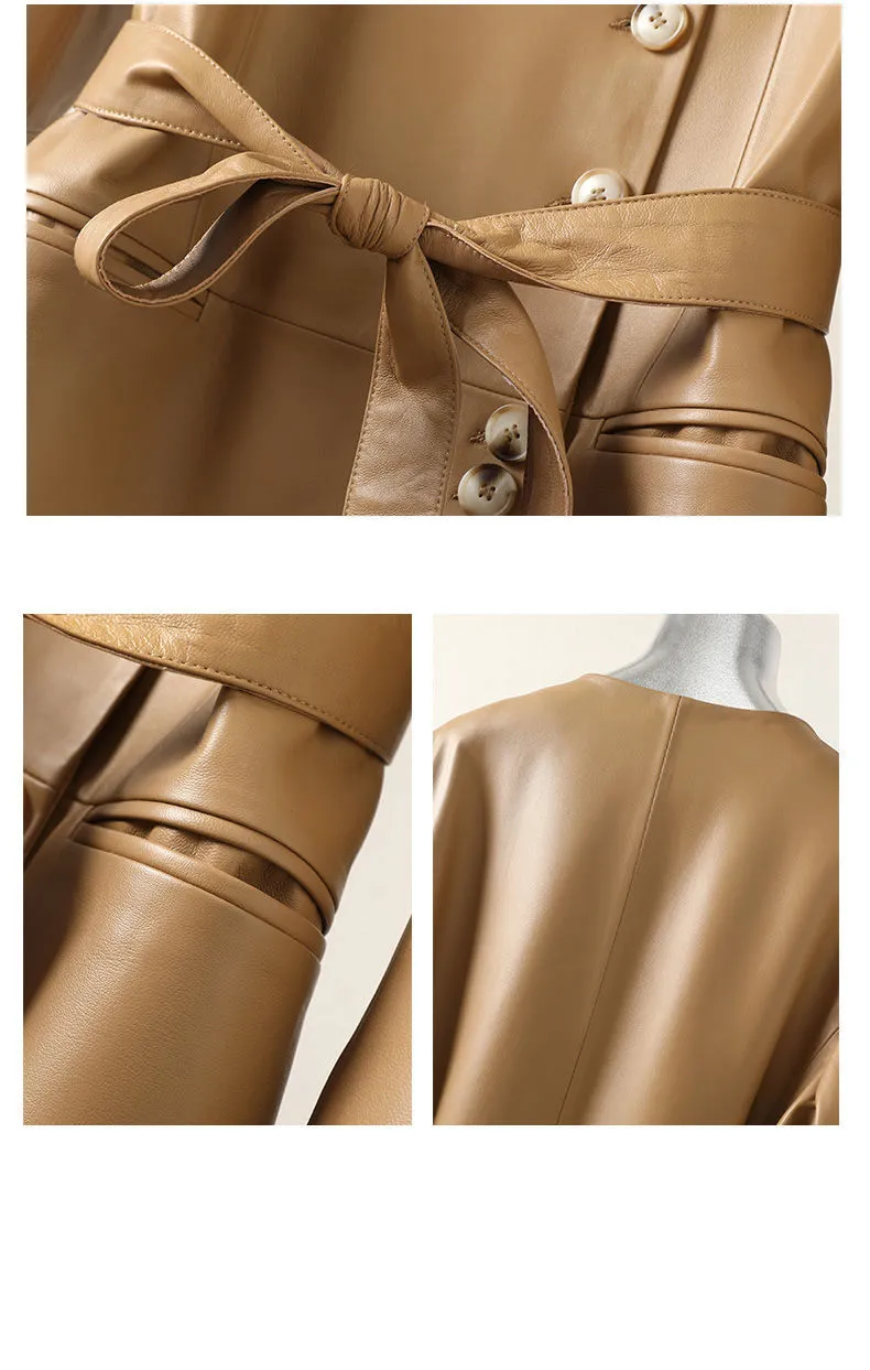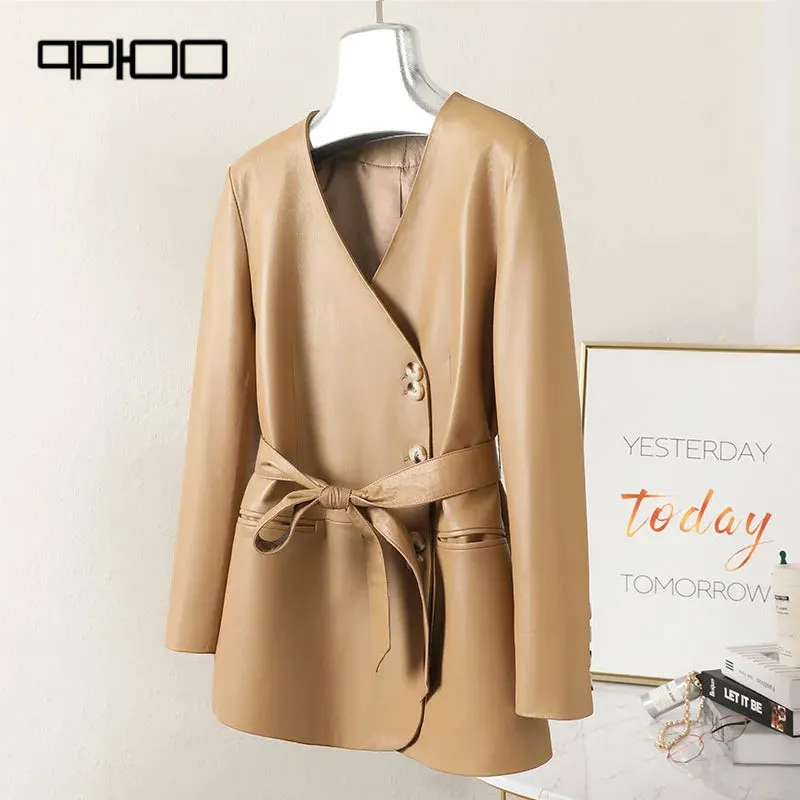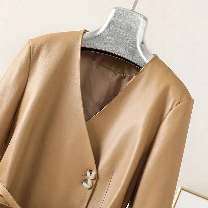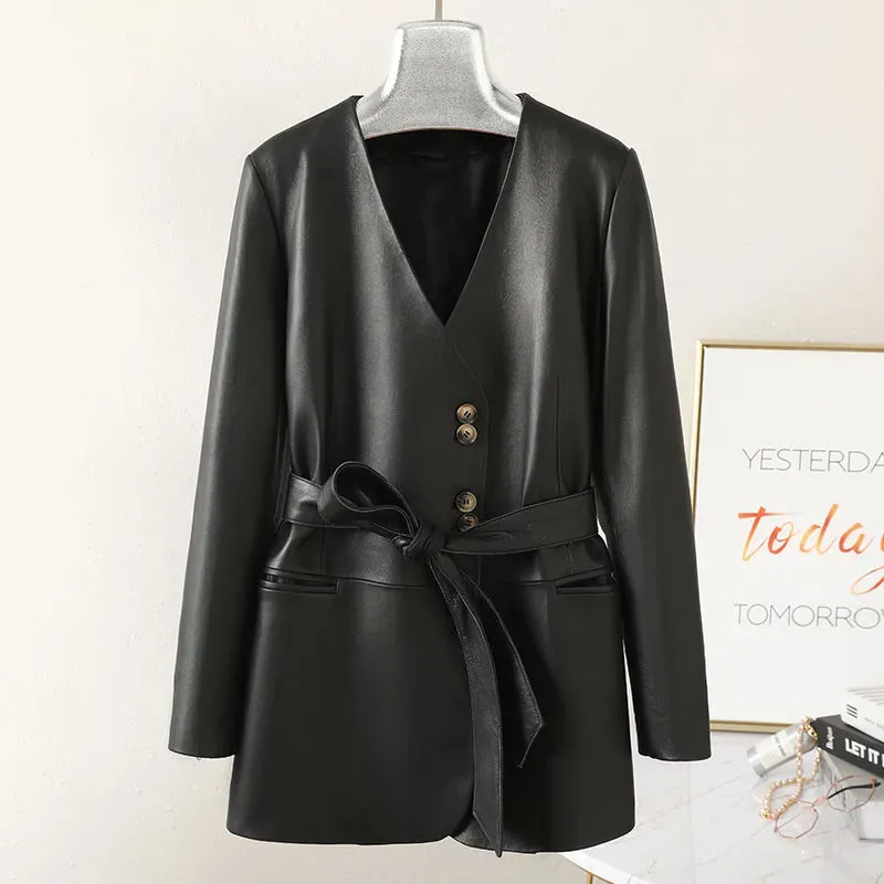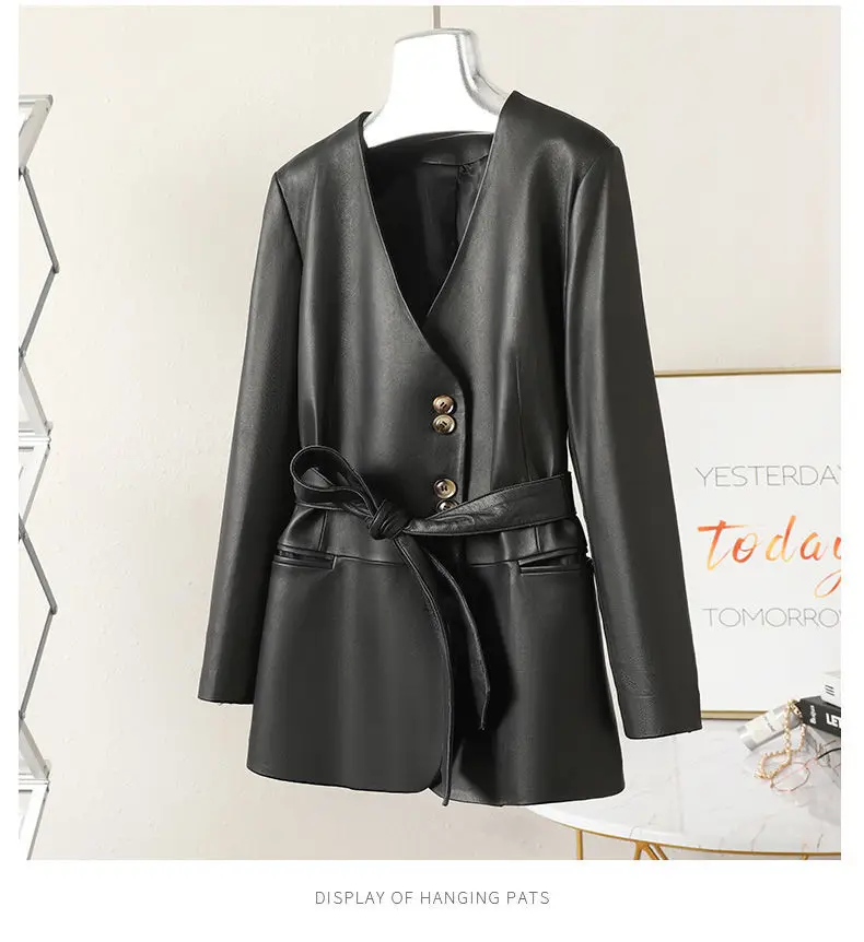 Отзывы о Женское пальто из натуральной овечьей кожи черное с v-образным вырезом и поясом