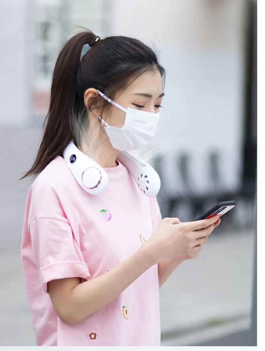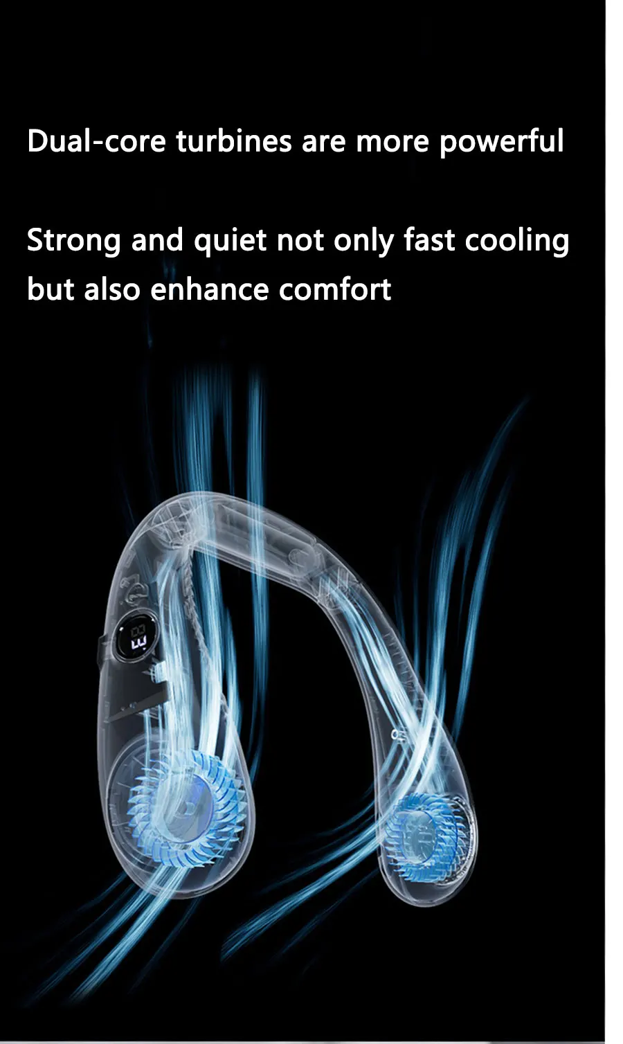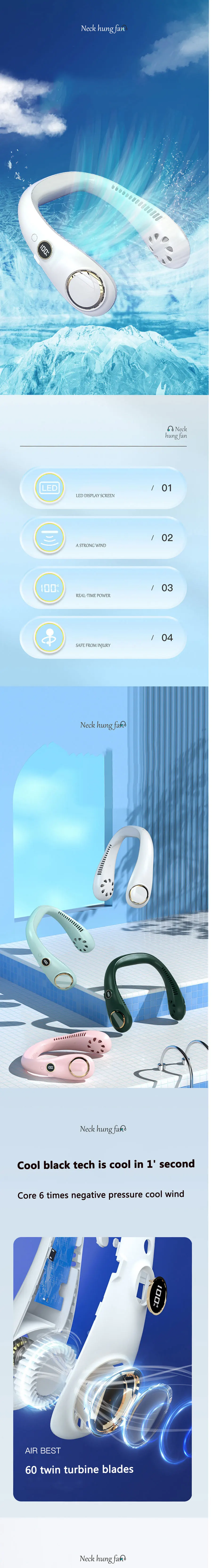 This neck-mounted fan has three wind speeds. LED digital display, real-time monitoring, function, gear, power. Low noise, bring cool feeling to your summer.