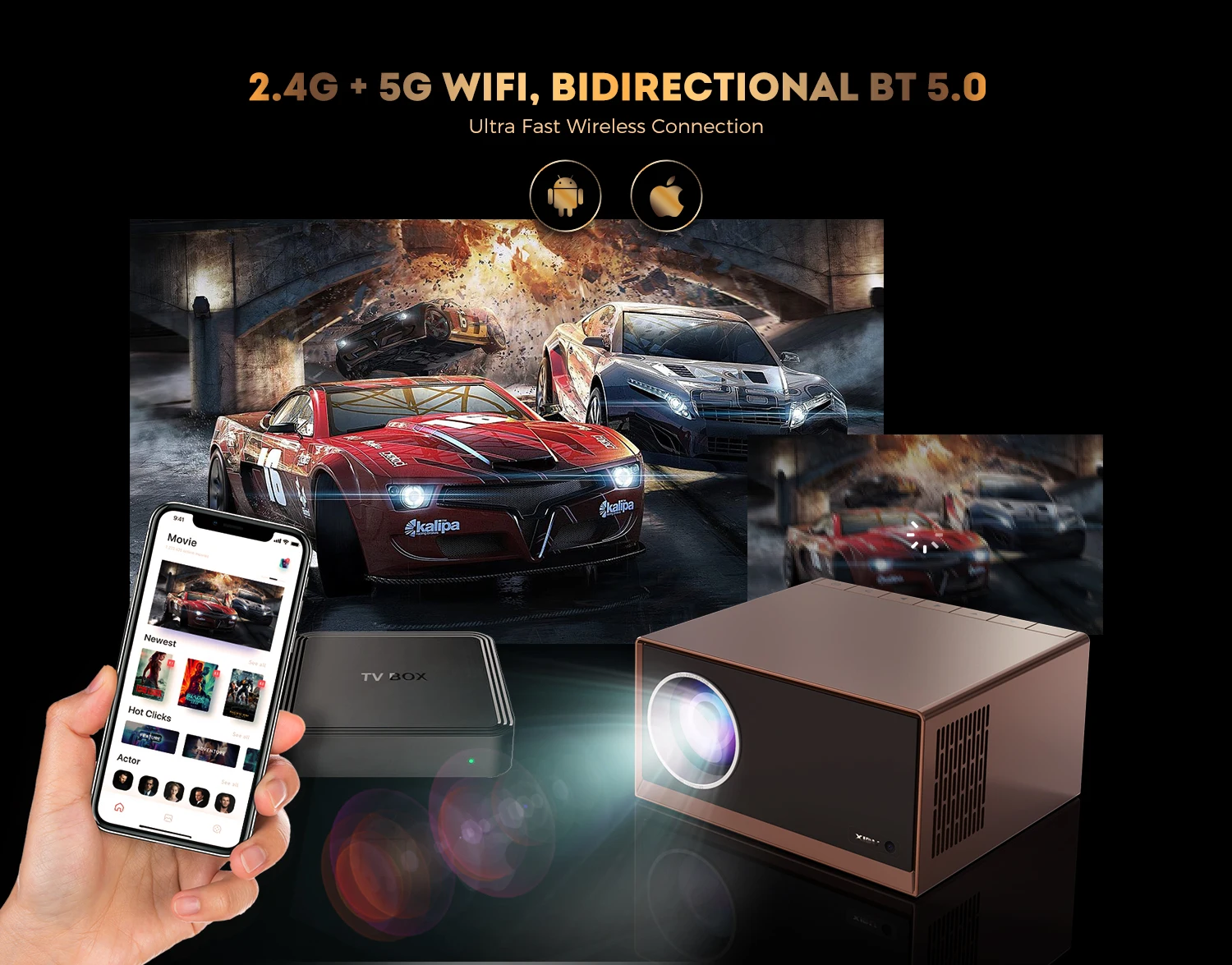Немедленно Подключите устройство к проектору. С использованием усовершенствованной версии двухдиапазонной технологии Wi-Fi. 5G Wi-Fi с более быстрой скоростью добавляется к оригинальному Wi-Fi 2,4G, что делает распространение сигнала wifi более сильным и скорость передачи данных быстрее. Наслаждайтесь быстрой, гладкой и низкой задержкой с возможностью выбора различных частот wifi в зависимости от различных условий использования. Вы также можете использовать кабель HDMI для подключения.