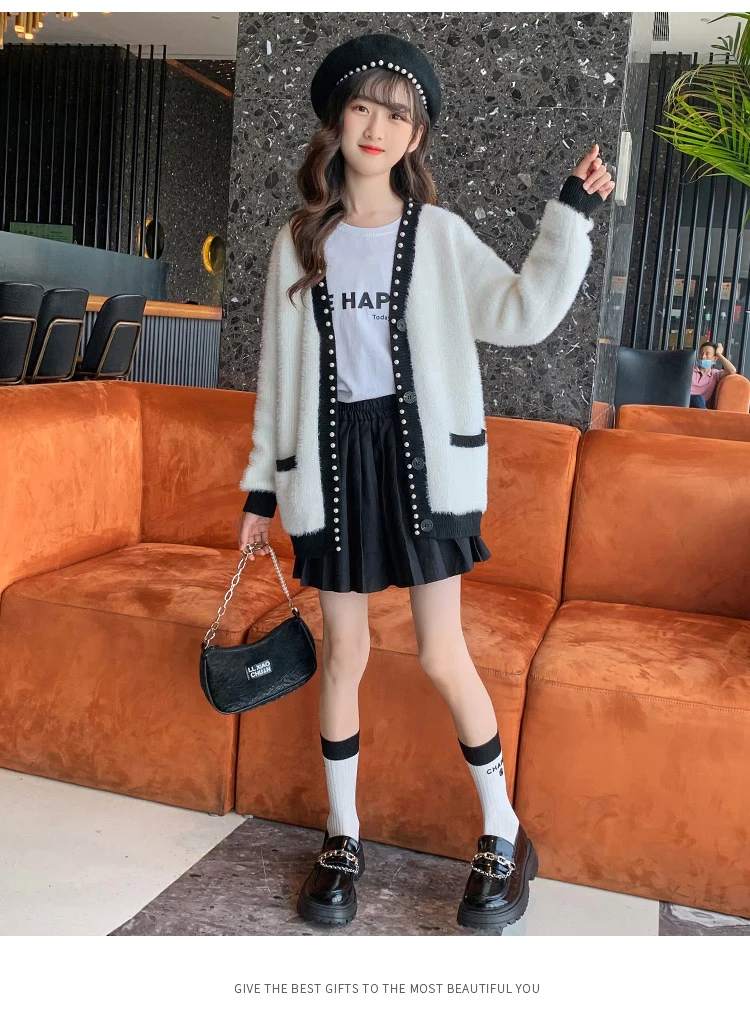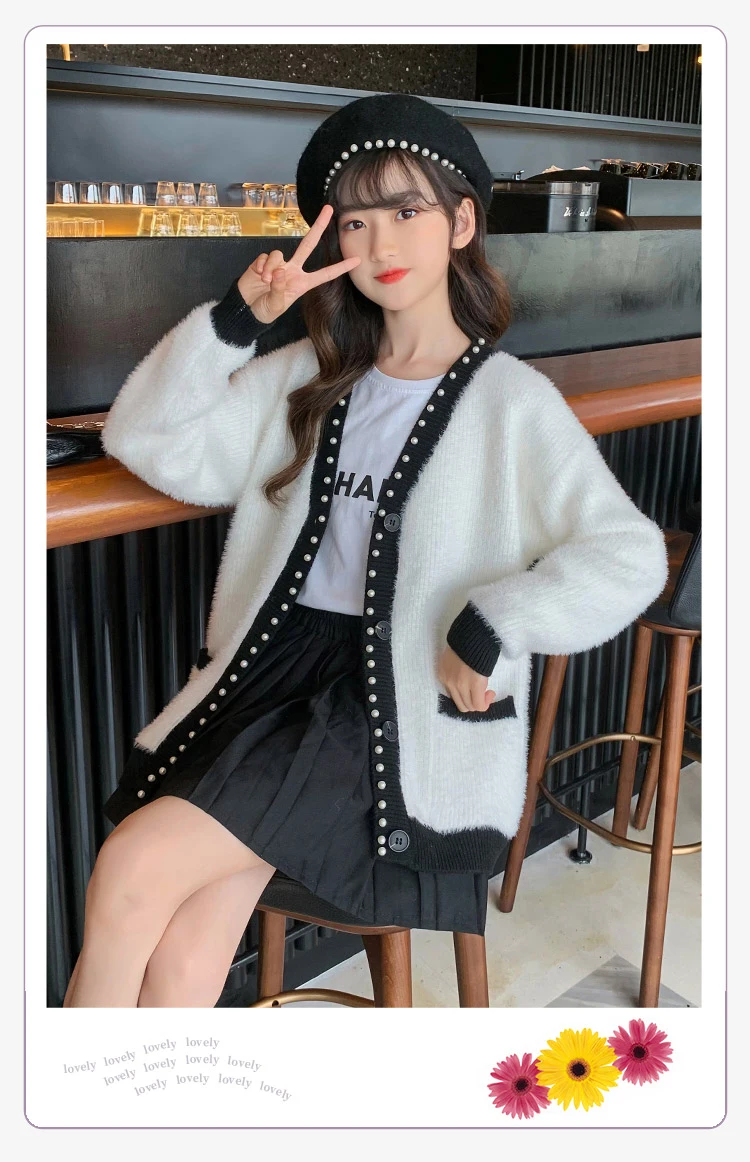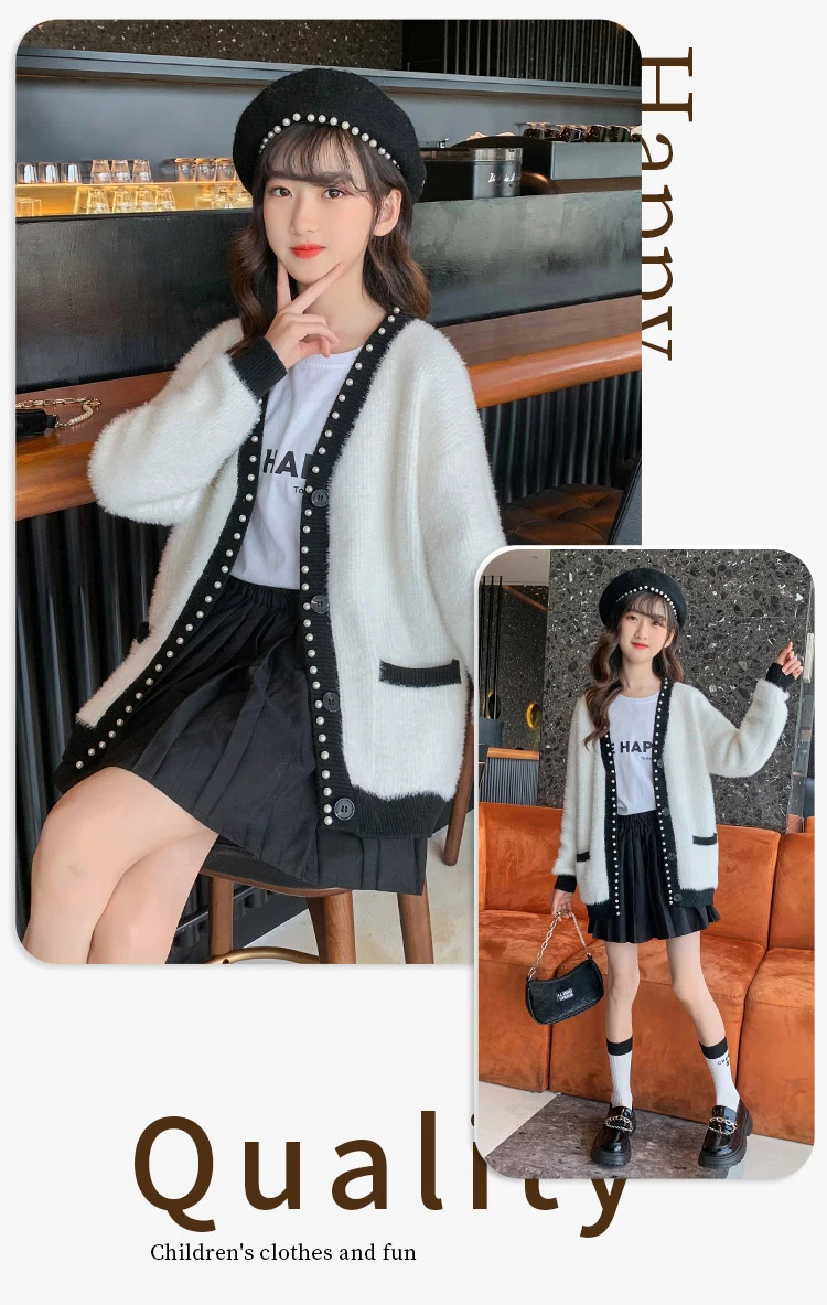 2022 г. Весенне-осенний детский вязаный свитер из искусственной норки свитер для девочек с роскошным дизайном и жемчугом дешевый свитер Брендовое зимнее теплое пальто
