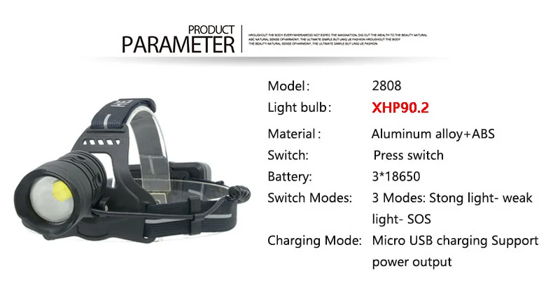 Спецификация:1. Название бренда: Litwod2. Название модели: 28083. Количество: 1 шт.4. Бусины: XH P90.25. 3 режима: сильный светильник-слабый светильник-SOS6. Срок службы лампы: 100000 часов7. Фара: Цвет: черный8. Излучаемый Цвет: белый светильник9. Переключатель: нажмите переключатель10. Чехол Материал: Прочный авиационный алюминий11. Чистая Вес: около 0,2 кг12: светодиодный срок службы: более 100000 часов13. Расстояние освещения: более 200-500 метров14. В 4 раза ярче, чем XML L215. Отражатель: выпуклая линза16. Люмен: максимум 4292 люмен17. Характеристики: перезаряжаемый Micro USB18 . Водонепроницаемость: Да, IPX619. Требуемая модель аккумулятора: аккумулятор 3x1865 0, около 7800 мАч, может использоваться как мобильный источник20. 3 аккумулятора 18650 могут работать более 8 часов.21. Советы по использованию фар XHP9.20:Мы рекомендуем использовать нашу высококачественную зеленую батарею 18650 емкостью около 2600 мА/шт. 3 шт. 18650 батареи около 7800 мАч, они могут удовлетворить фары XHP90.2 в течение длительного времени на открытом воздухе. Он может работать в течение 8 часов и может использоваться какМобильный источник питания.Советы: