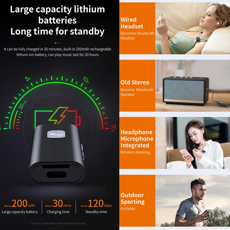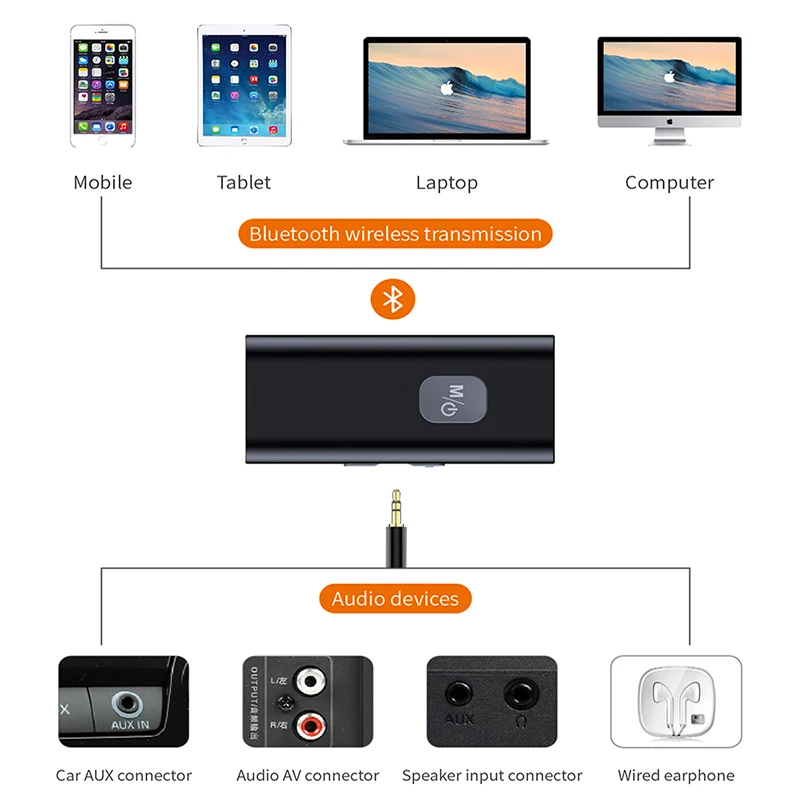 Универсальная совместимость: Этот Bluetooth 5,0 приемник может быть подключен к любому A/V приемники и каких-либо активные колонки со стандартным разъемом 3,5 мм, идеально подходит для домашнего кинотеатра, Hi-Fi стерео, и автомобильными стерео-и акустическими системами также подходит для iPhone, iPad,iPod Touch, смартфонов и устройств Android.