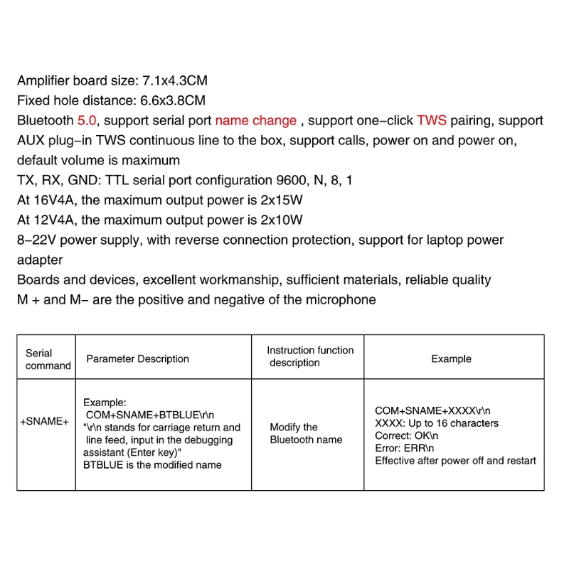 Совместимость с Bluetooth 5,0, поддержка последовательного порта для изменения имени, Поддержка сопряжения TWS с одним ключом, поддержка AUX для вставки TWS в непрерывную линию коробки, поддержка звонков, включение питания, максимальный объем по умолчанию