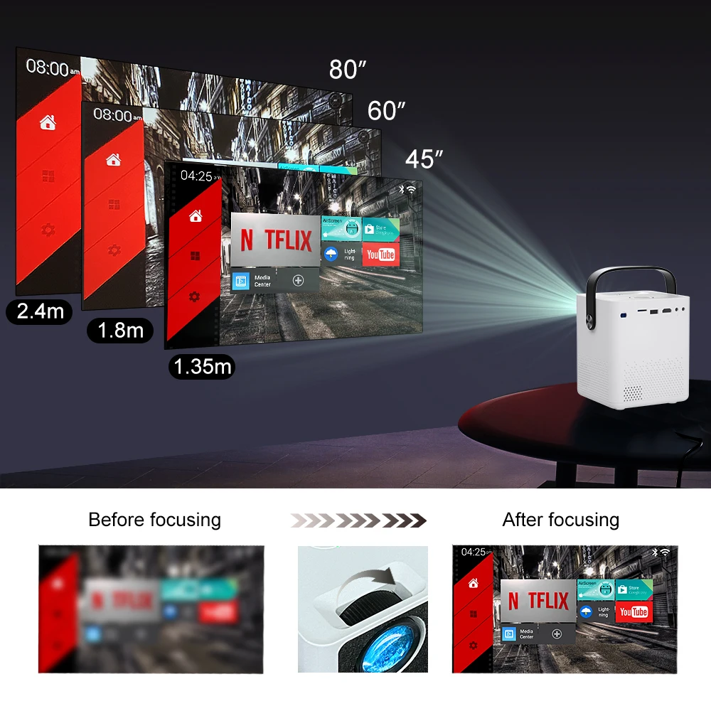 4. Как и у всех светодиодный проекторов, чем выше яркость, тем громче шум. Покупатели могут попробовать заменить вентилятор низкой мощности, но это уменьшит яркость и теплоотдачу. Мы не принимаем такие споры. 5. Из-за технических характеристик ЖК-дисплея минимальный размер проекции составляет 40 дюймов, в противном случае он не может быть четко отрегулирован.