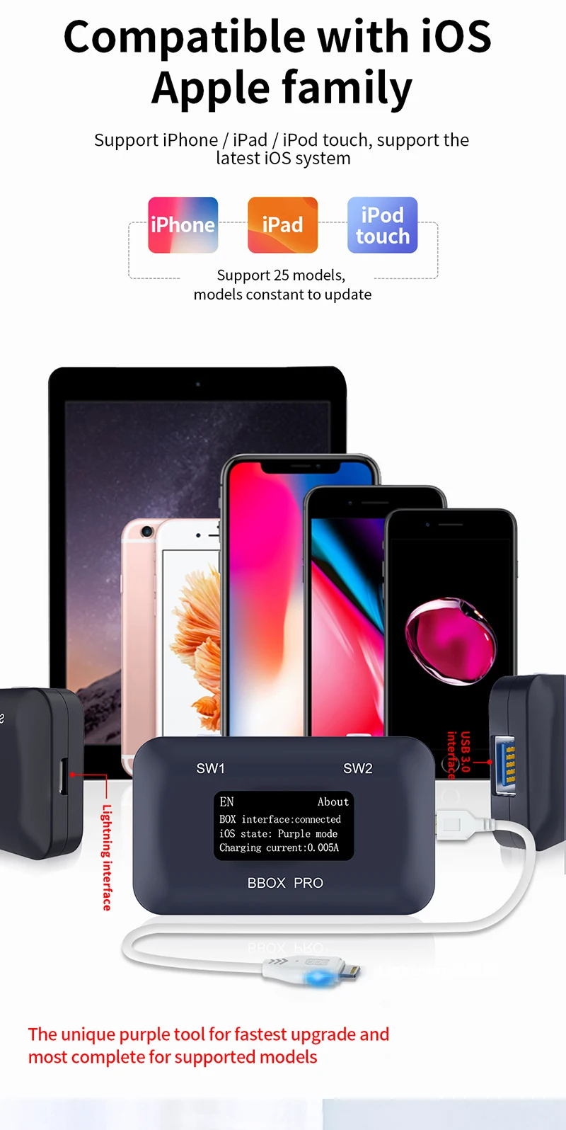 1. B-BOX поддерживает большинство полных моделей для всех устройств iOS от A7-A11, поддержка ipxne SE-X, iPxd mini 4, ipxd 5 / 6, ipxd Pro (10,5), ipxd PRO2 (12,9), В настоящее время iPad 2019 поддерживает больше моделей с помощью бесплатного обновления в future2. B-BOX использует автономный алгоритм syscfg, 100% коэффициент успеха на физическое тестирование, намного превосходящий другие устройства или программное обеспечение, также гораздо более стабильный. 3. B-BOX поддерживает один ключ к универсальным экранам DTP / C11 для 7-8P.