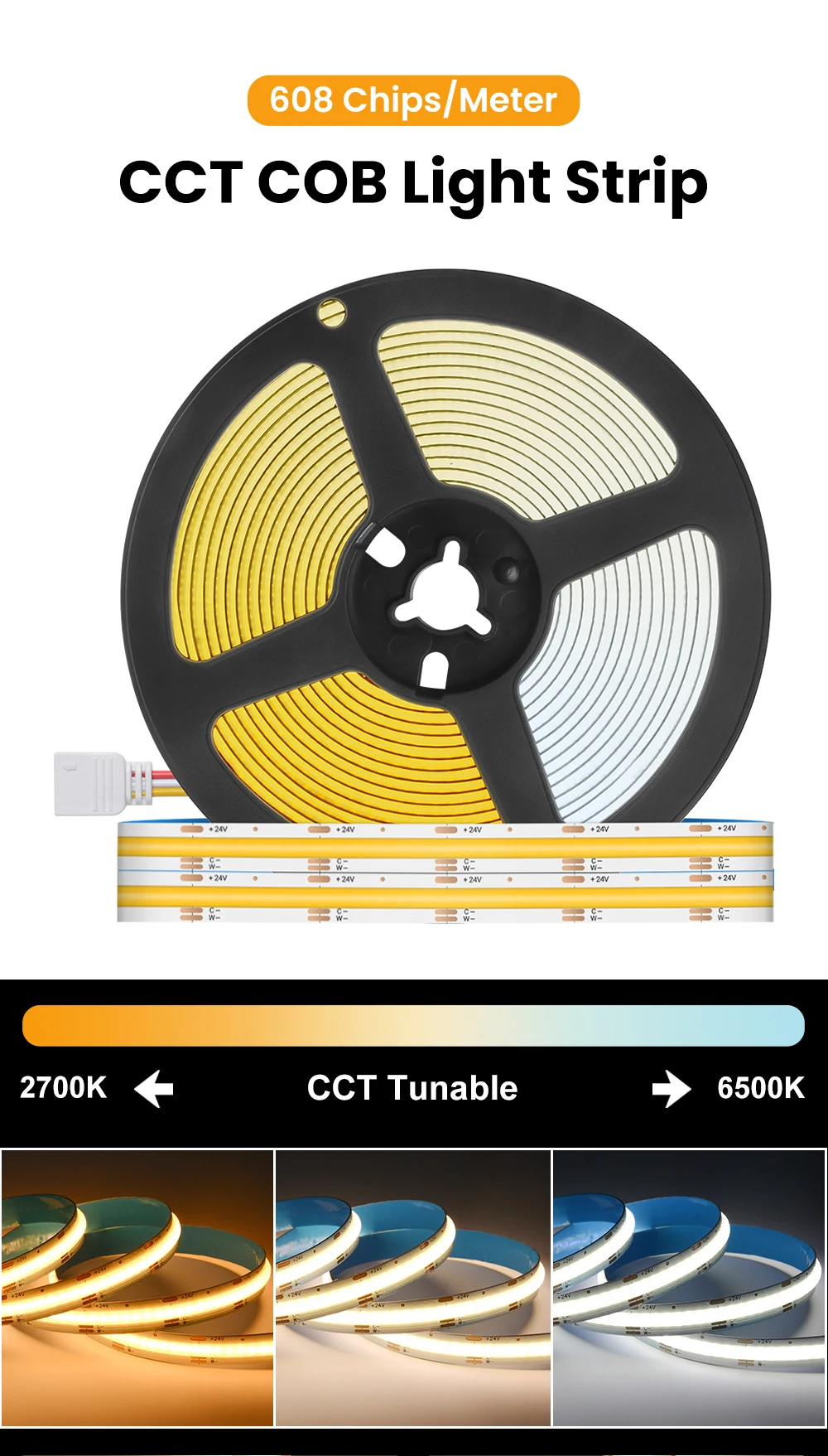 24V 10 мм IP20 CCT COB Светодиодные ленты светильник 2700-6500K Цвет Температура Dimmable высокой плотности мягкая 608 светодиодов/m LED лента диод номер Декор