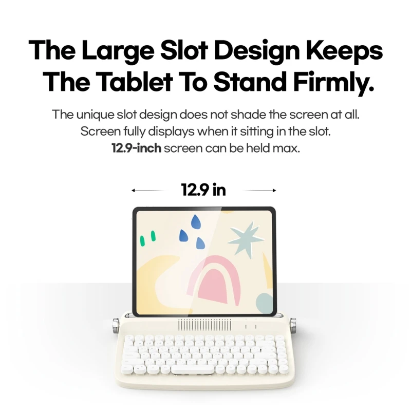 Беспроводная клавиатура разработана с интегрированным держателем подставки, чтобы соответствовать эстетике стола и более экономит пространство. Клавиатура также включает в себя регулируемые ножки кнопок, которые могут обеспечить комфортное долгое время ввода текста. В Встроенная для планшета держатель для планшета 12 дюймов в длину и 0,59 дюйма в ширину.