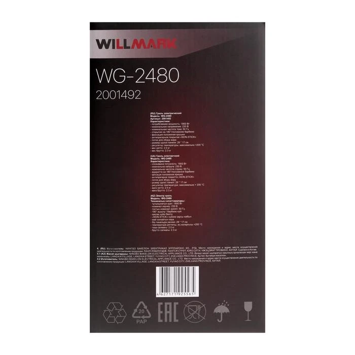 Электрогриль WILLMARK WG-2480, 1800 Вт, антипригарное покрытие, 28х17 см 5864031