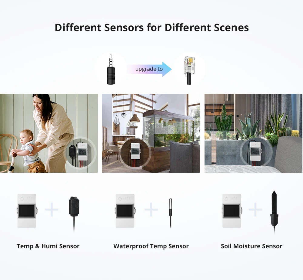 SONOFF TH Elite поддерживает три вида температурного монитора и датчика влажности, s-THS01 датчик температуры и влажности, водонепроницаемый датчик температуры DS18B20 и датчик влажности почвы MS01. Коннектор датчика обновлен до RJ11, поддерживая горячее подключение делает соединение более стабильным и надежным.