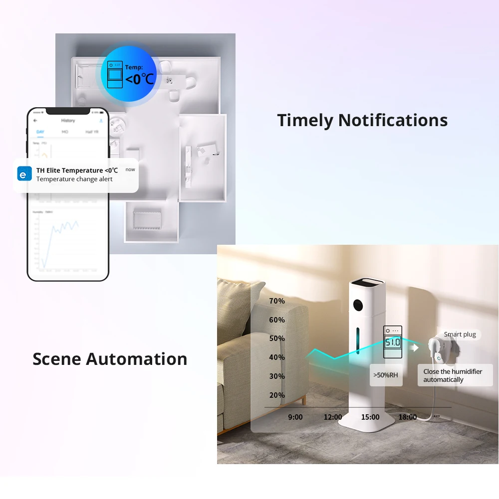 Продолжает следить за температурой и влажностью в режиме реального времени, как только они достигают заданного порога или изменения состояния вкл/выкл устройства, вы получите Push-уведомление на телефоне.