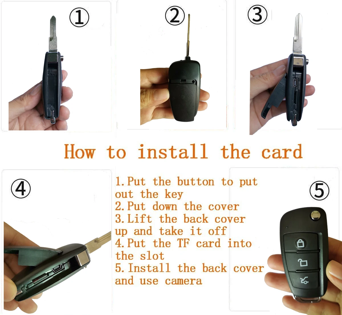 5,1080 P HD видео фото: этот брелок камера может обеспечить более широкий угол объектива до 140 °, поддерживает потрясающее качество HD видео 1080P. Реалистичный дизайн ключа автомобиля, никто не заметит, что камера, похожая на ключ автомобиля, наблюдает, Потоковое видео с высоким разрешением обеспечивает более четкое изображение, не пропуская никаких мелких деталей в процессе монитора. Файлы автоматически сохраняются на micro sd-карте.