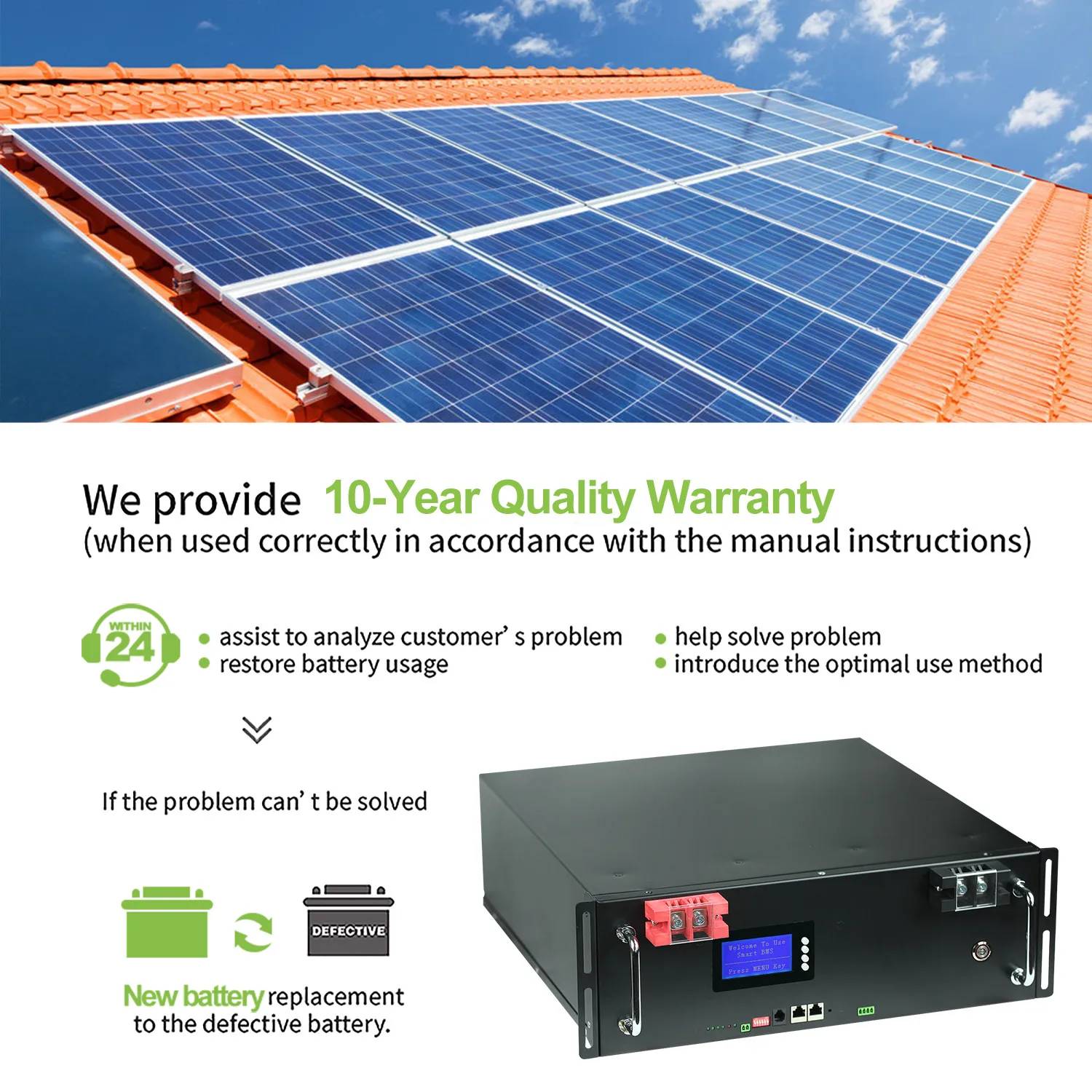 Батарея LiFePO4 обеспечивает 6000 циклов, что более 10 раз приводит к кислоте с 400 циклами. LiFePO4 батарея имеет 10-летний, длительный срок службы, в три раза дольше, чем свинцово-кислотный 3-летняя.