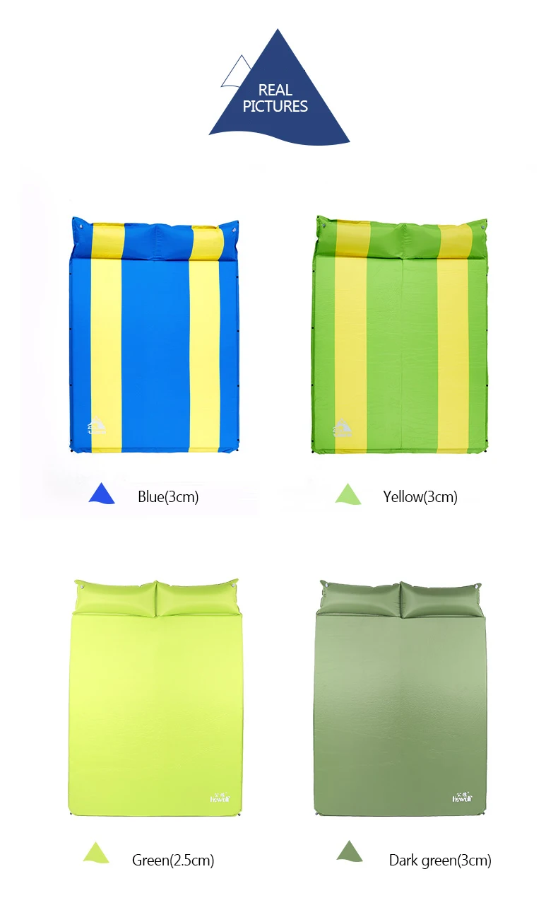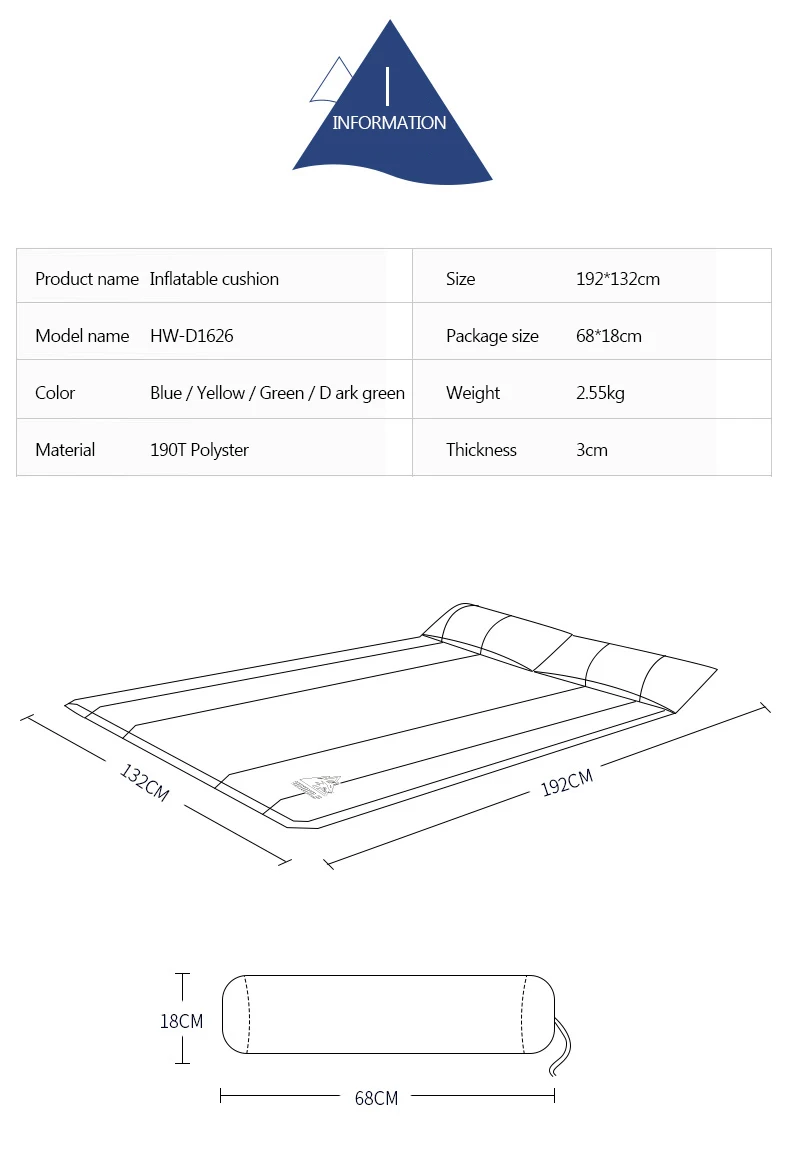 Описание продукции:Тип: однострочный Автоматический надувной коврик для кемпингаЦвет: синий/зеленыйРазмер (один):192x66x3cmРазмер (двойной):192x132x3cmРазмер (три):192x168x3cmЧистая Вес (однометный): 1,3 кгЧистая Вес (двойная): 2,6 кгВес нетто (три): 3,9 КГТолщина: 3 смМатериал: высокая эластичность пены памятиТкань: полиэфирная ткань 190TОсобенности:1. Высокое качество, высокая эластичность пены памяти2. Цельная воздушная подушка, мягкая, удобная и портативная3. Выберите благоприятную для кожи ткань из полиэстера, дышащая4. Толщина 3 см, эффективное и разумное снижение веса без снижения комфорта5. Двухсторонний процесс склеивания эффективно предотвращает скольжение и делает ваш опыт более комфортным.