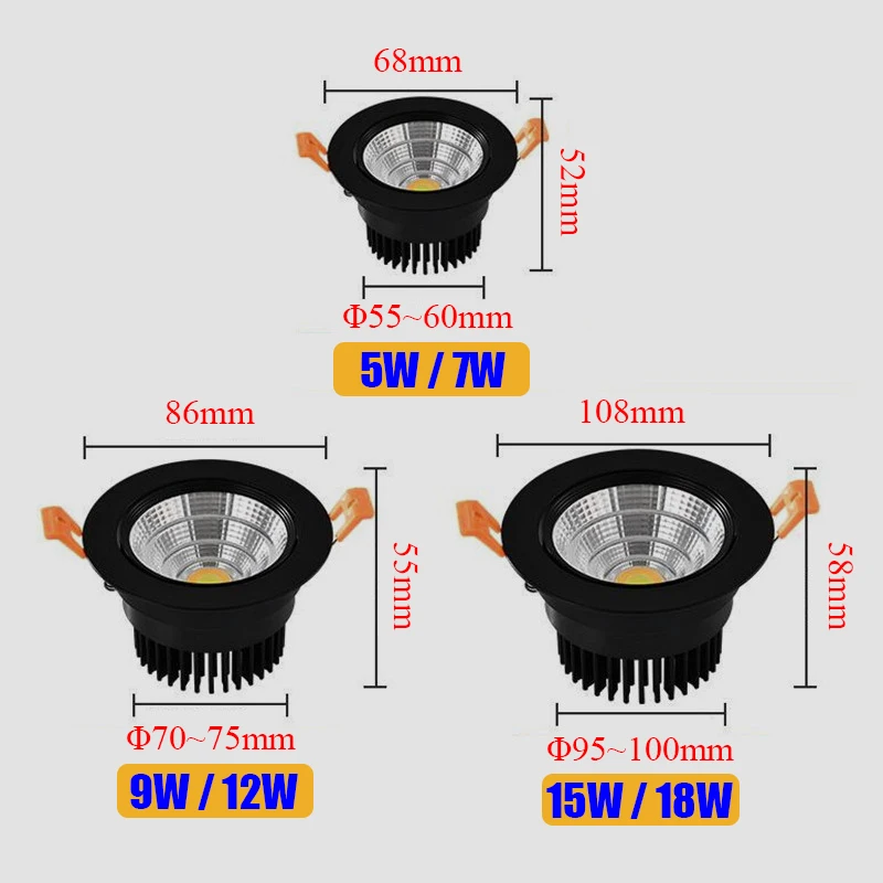 Затемняемый встраиваемый COB светодиодный светильник 5 Вт 7 Вт 9 Вт 12 Вт 15 Вт 18 Вт светодиодный точечные потолочные светильники AC110 ~ 240 В светодиодный потолочный светильник для внутреннего освещения