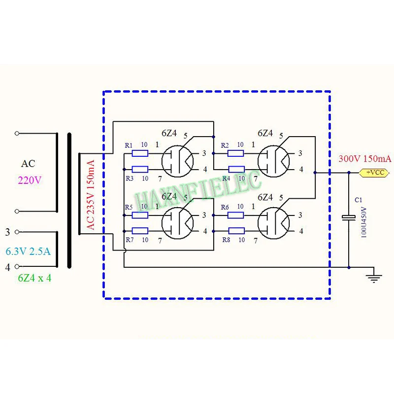 Использование цепи:Вход переменного тока в переменный ток высокого напряжения с двумя линиями вход переменного тока накаливания 6,3 V 2.5A переменного тока с двумя линиями, выход постоянного тока высокого напряжения с двумя линиями.