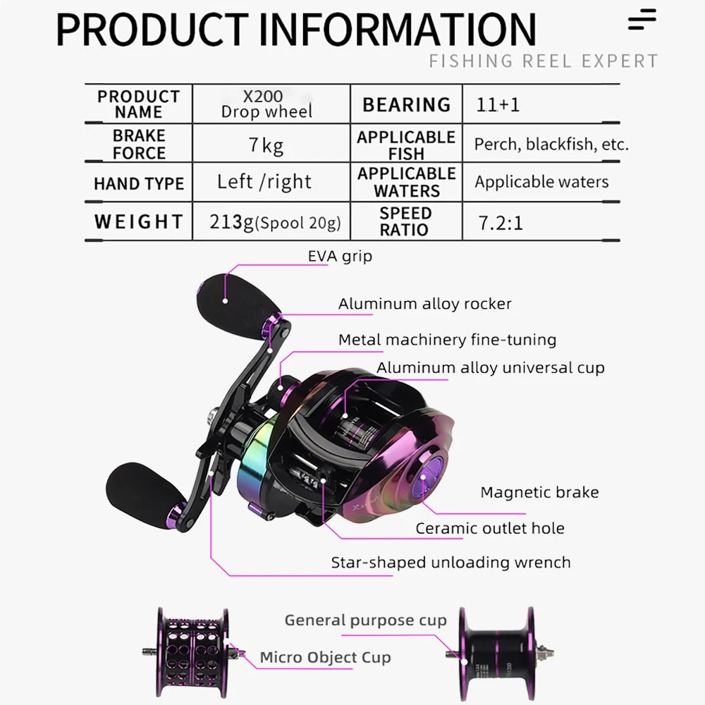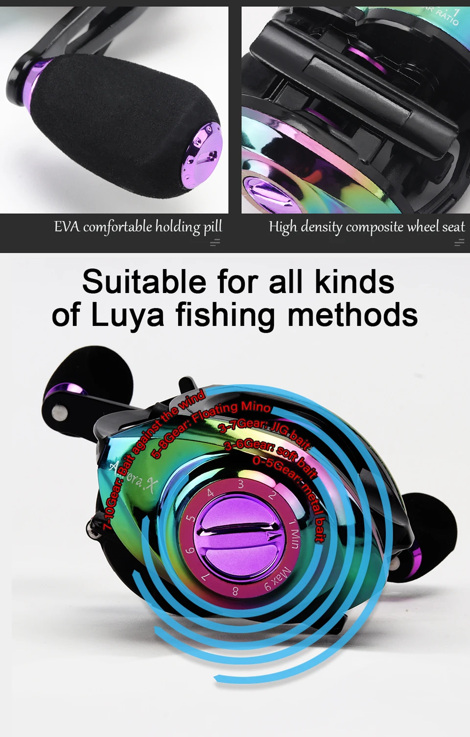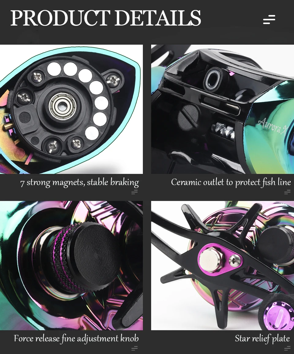 + 7 сильные магниты, 27-уровень с твёрдым анодированным покрытием, магнитное управление системой анти-взрыва линии, легко справляется с различными приманка методов рыболовства