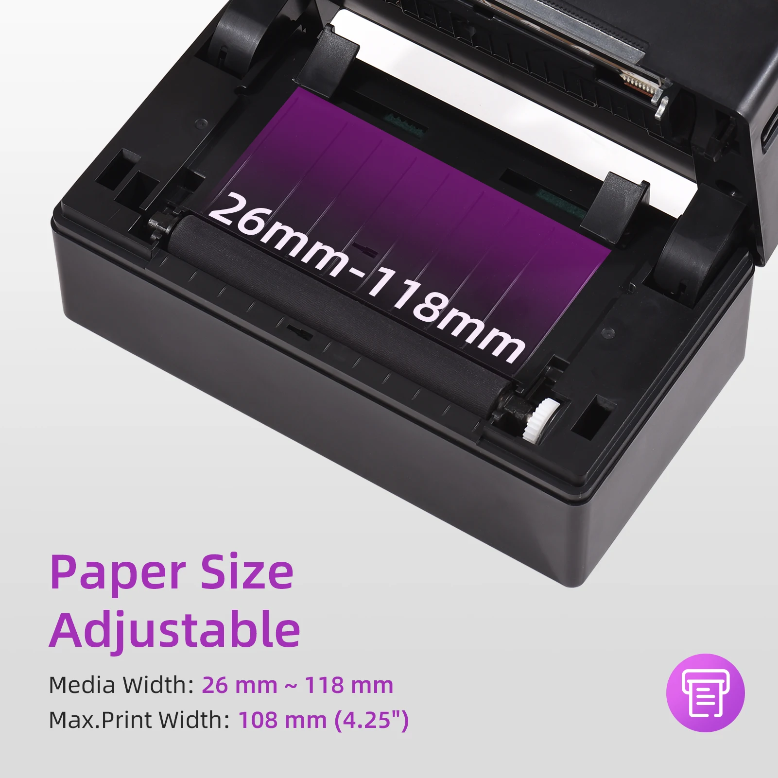 ♦[Чистая Печать] Высококачественная печатающая головка с разрешением 203dpi, обеспечивающая четкое качество печати и надежную работу и низкий уровень шума. 50 км печати головы жизни может служить вам долгое время использования. Максимальная ширина печатной бумаги составляет 110 мм, а Эффективная ширина печати-108 мм.