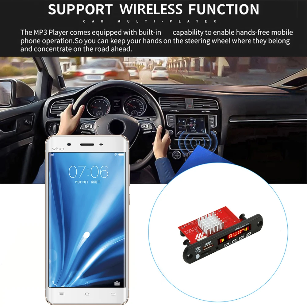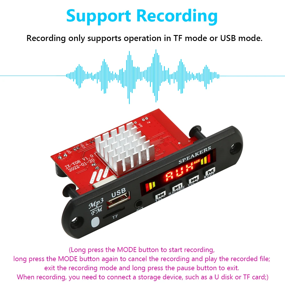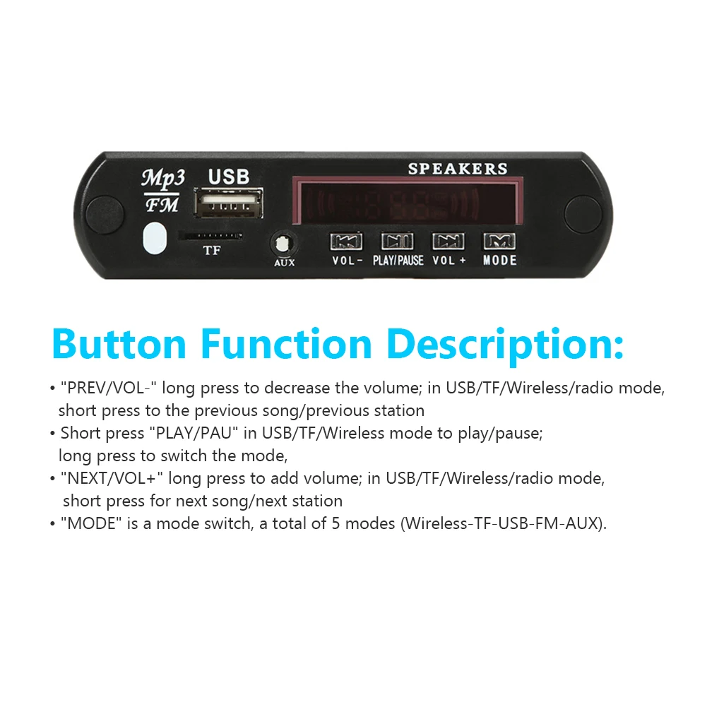 1. Функция:Совместимость с Bluetooth версии 5,0. Поддержка вызова (нажмите кнопку паузы, чтобы ответить на вызов при входящем вызове). Запись поддерживается только в режиме TF или в режиме USB. (Удерживайте кнопку MODE, чтобы начать запись, удерживайте кнопку MODE снова, чтобы отменить запись и воспроизвести записанный файл; Выходите из режима записи и удерживайте кнопку паузы, чтобы выйти из него. При записи необходимо подключить устройство хранения данных, например u-диск или tf-карту;). Поддержка памяти отключения питания. Напряжение источника питания поддерживает 8 В-24 В постоянного тока, а ток-от 1 до 4 А. Может быть непосредственно подключен к динамикам, с усилителем мощности и функциями декодирования.