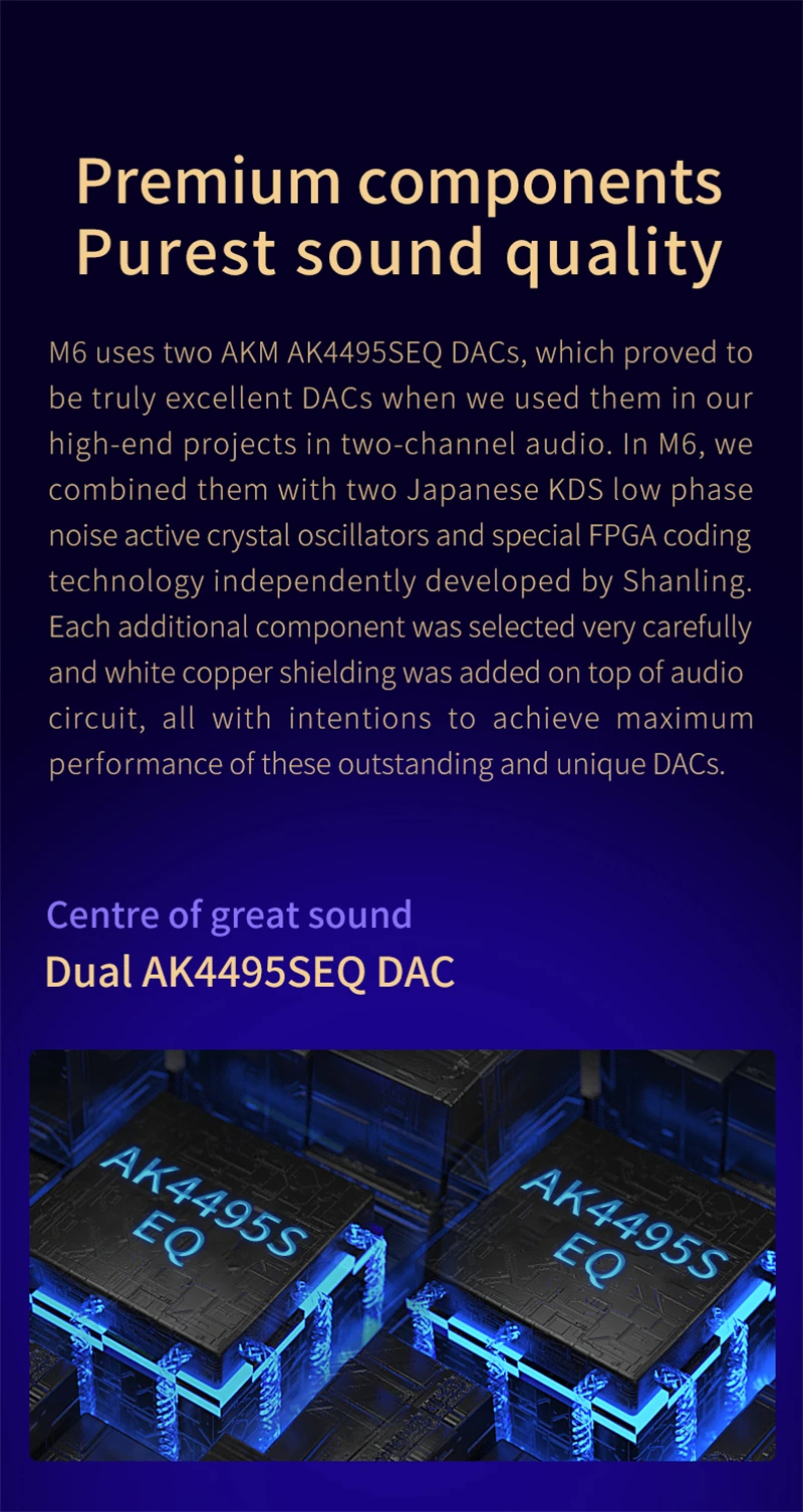 M6 использует два AKM AK4495SEQ DACS, которые оказались действительно отличными DACS, когда мы использовали их в наших высококачественных проектах в двухканальном аудио. В M6 мы объединили их с двумя японскими осцилляторами KDS с низким фазовым шумом и специальной технологией кодирования FPGA, независимо разработанной Shanling. Каждый дополнительный компонент был выбран очень тщательно, и белая медная защита была добавлена поверх аудиоцепи, все с намерениями достичь максимальной производительности этих выдающихся и уникальных DACS.