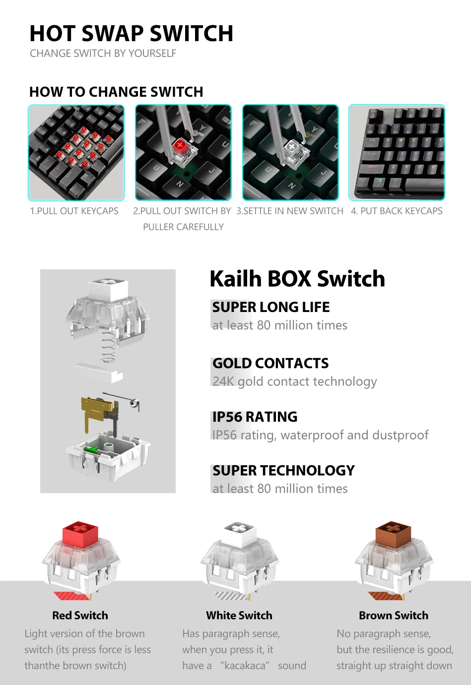 ● Премиум Kailh BOX Switch-до 80 миллионов раз нажатия клавиш,